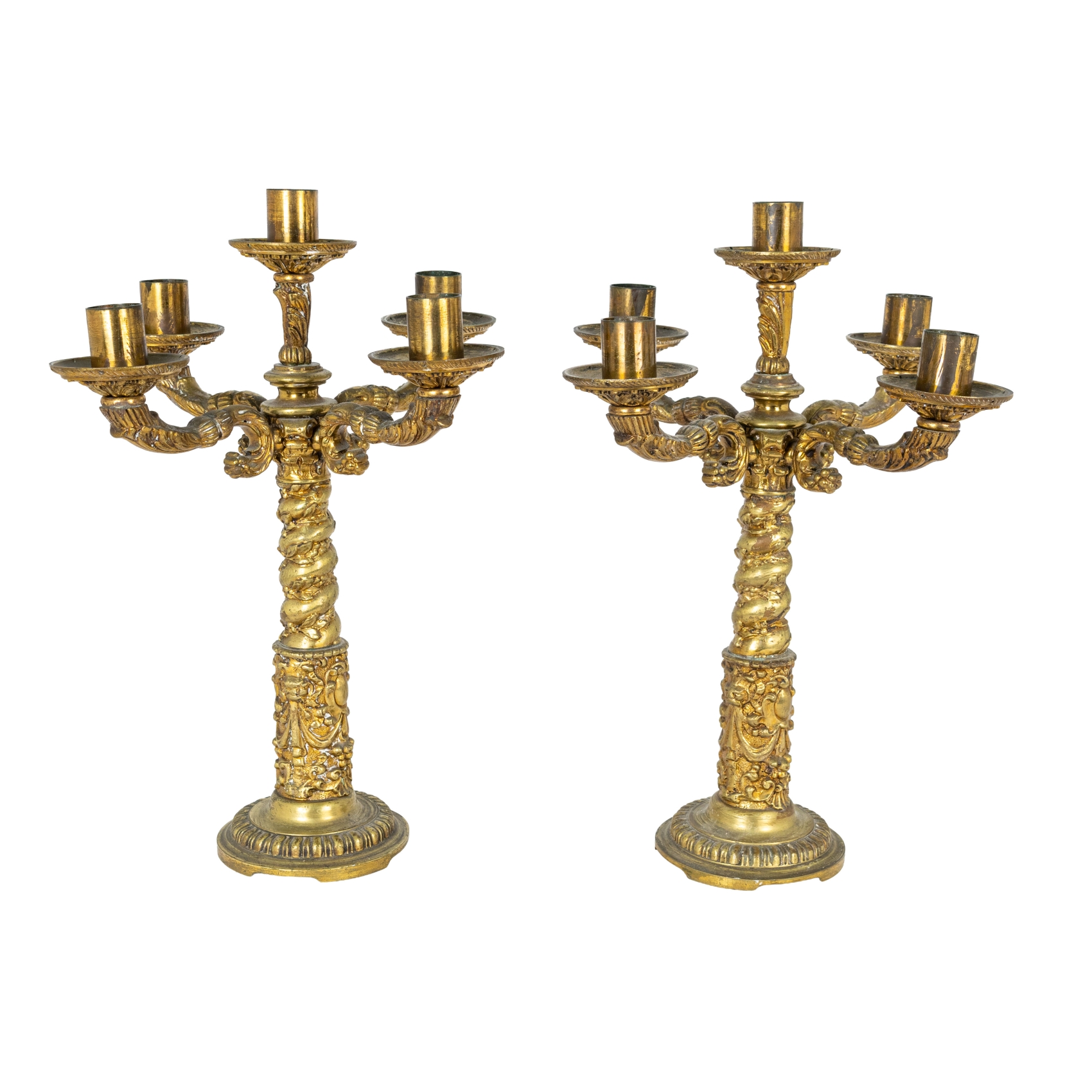 Pareja de candelabros de cinco luces en bronce dorado con fuste en forma de columna salomónica y decoración vegetal, s.XX.