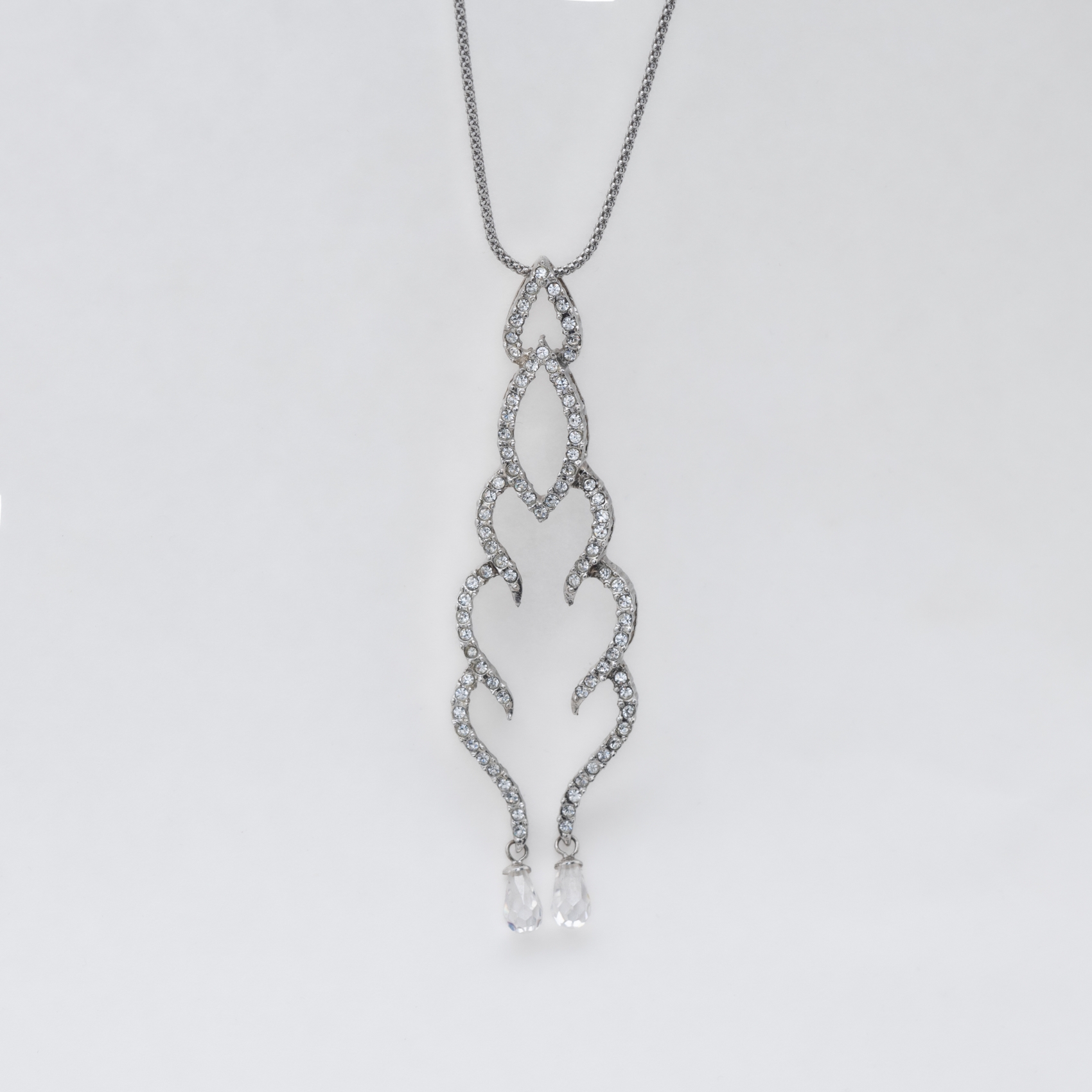 Gargantilla en plata rodiada con colgante diseño «chandelier» de formas curvilíneas en degradé cuajado de circonitas y rematado por dos briolettes de cuarzo de 7 x 4 mm.