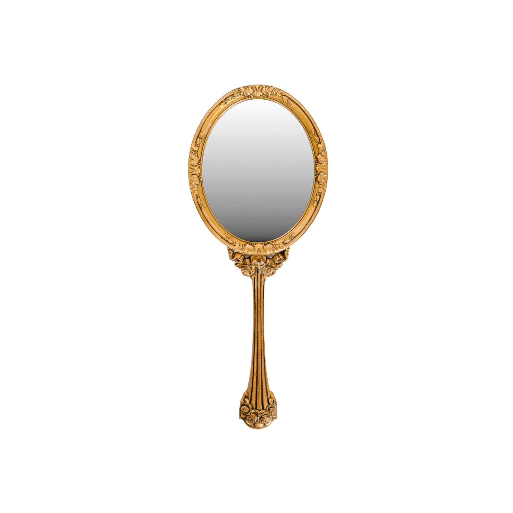 Espejo de tocador francés en bronce dorado y cristal biselado con representación de dama de época impresa al dorso, fles. del s.XIX.