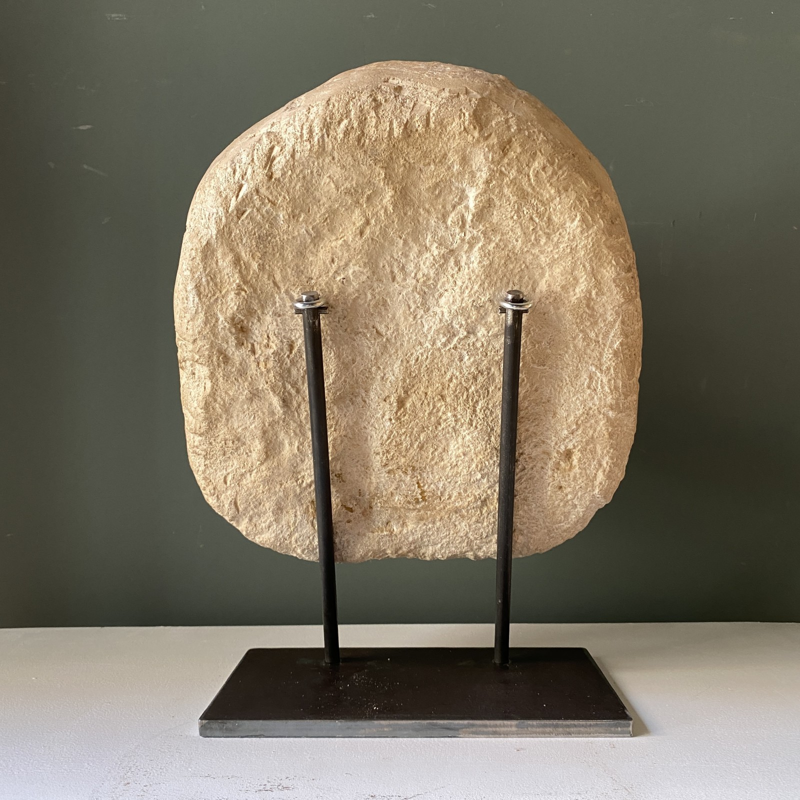 Escultura de estilo clásico en piedra caliza tallada sobre peana en hierro.