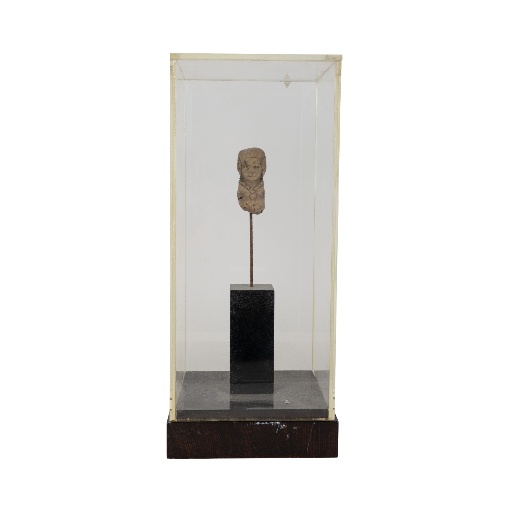 Escultura precolombina en terracota con representación de figura antropomorfa. Cultura Tumaco – La Tolita, actual Ecuador y Colombia, 500 a.C.-500 d.C. Custodiada en urna expositora. En buen estado de conservación, con algunas faltas. Adjunta certificado de autenticidad.