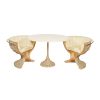 Mesa ovalada con dos sillones integrables en madera tallada y dorada con fuste y barandillas en bronce dorado con decoraciones de rosas en relieve, c.1980. Sobre posterior en madera lacada. Sillones retapizados en cuero color crema.