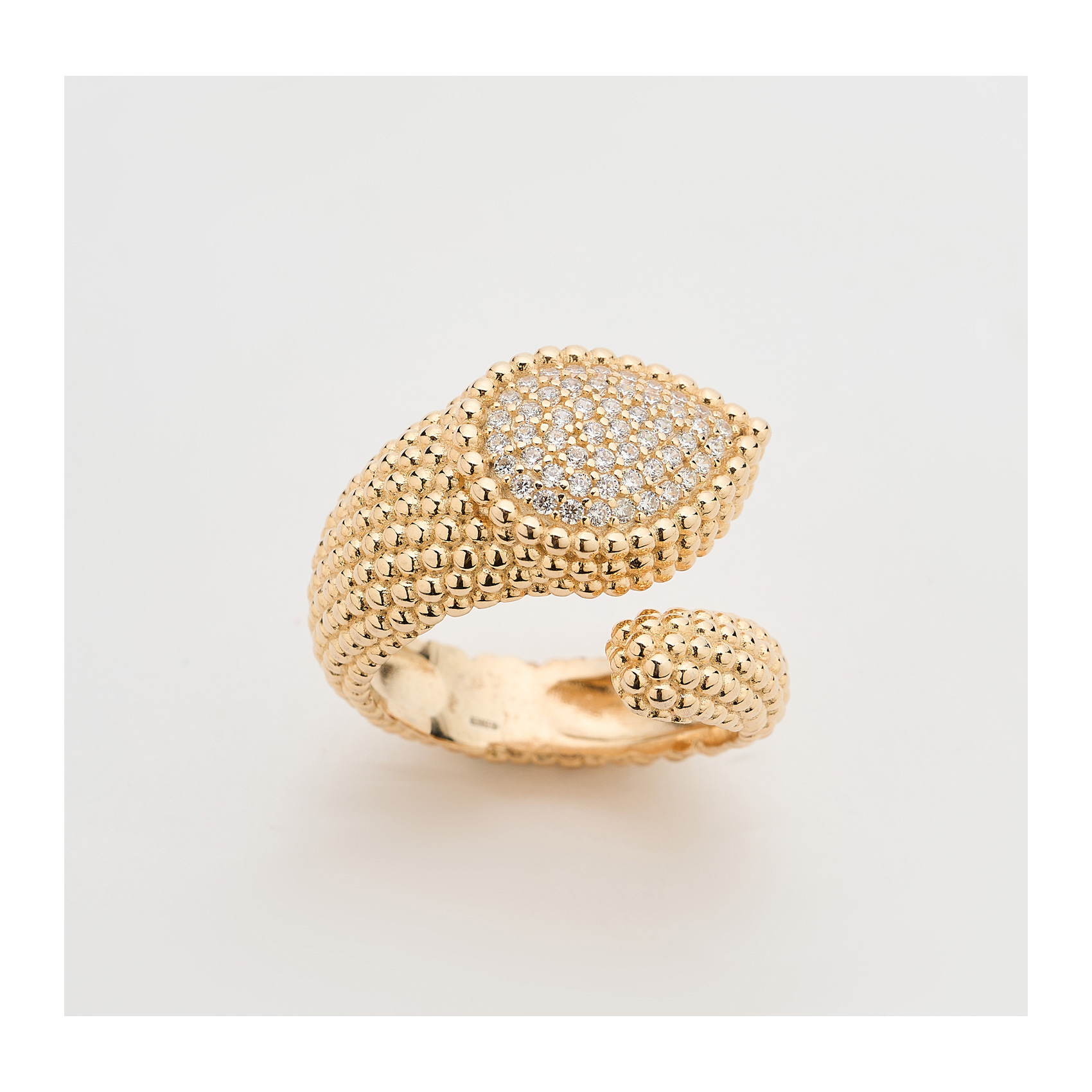 Sortija en plata dorada con centro abierto y rematado por lágrima de circonitas.