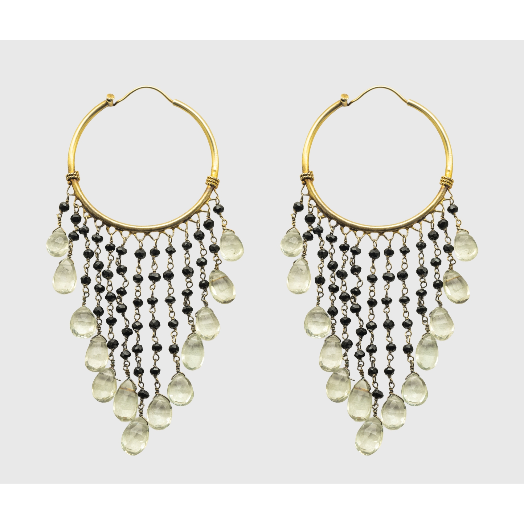 Pendientes criolla en plata dorada rematadas por tiras con cuentas de ónix de 2 mm y prasiolitas talla perilla de 10 x 8 mm.