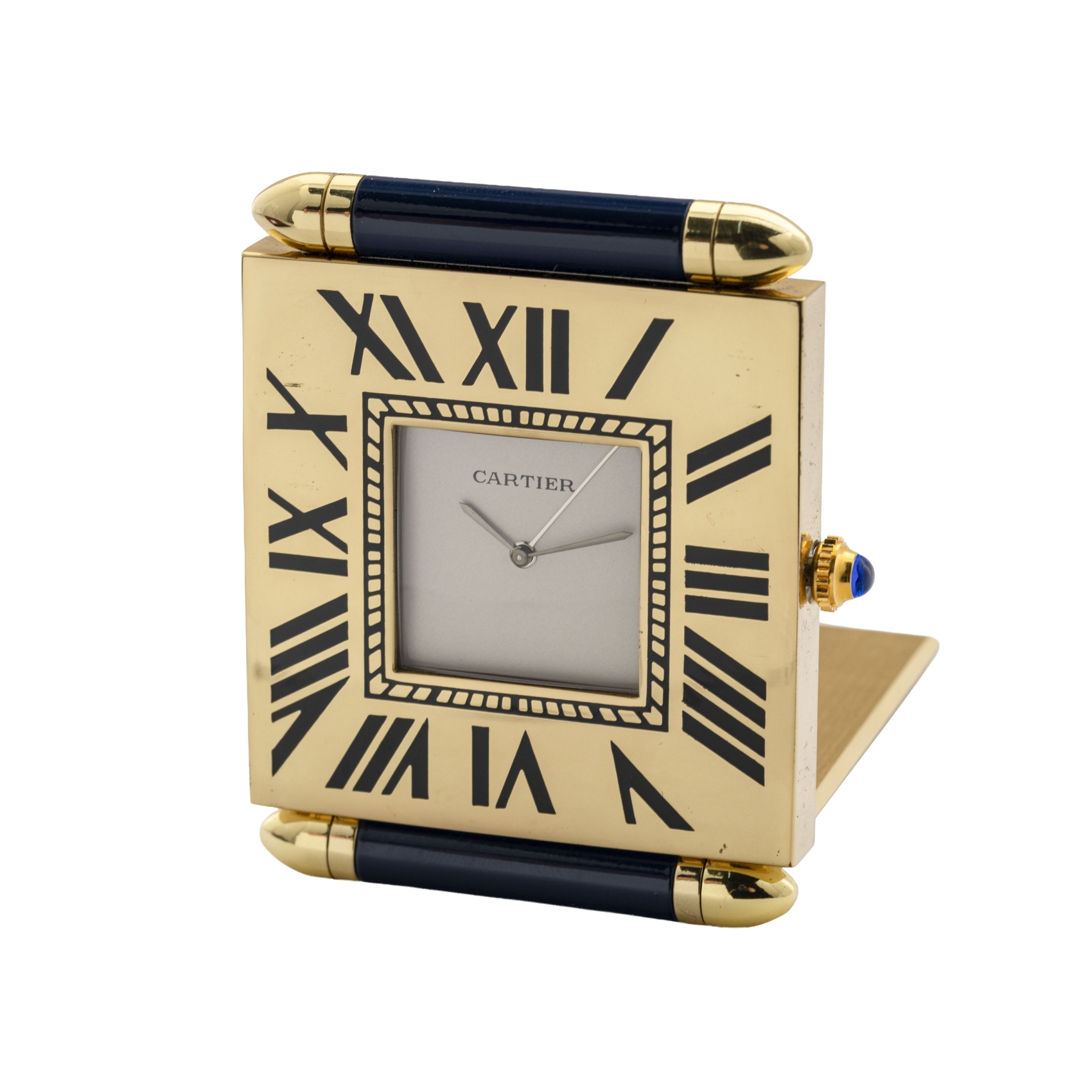 CARTIER. Reloj despertador en metal dorado y esmalte azul. Esfera blanca con agujas tipo espada con numeración romana. Mecanismo de cuarzo, c.1990. Adjunta funda original.