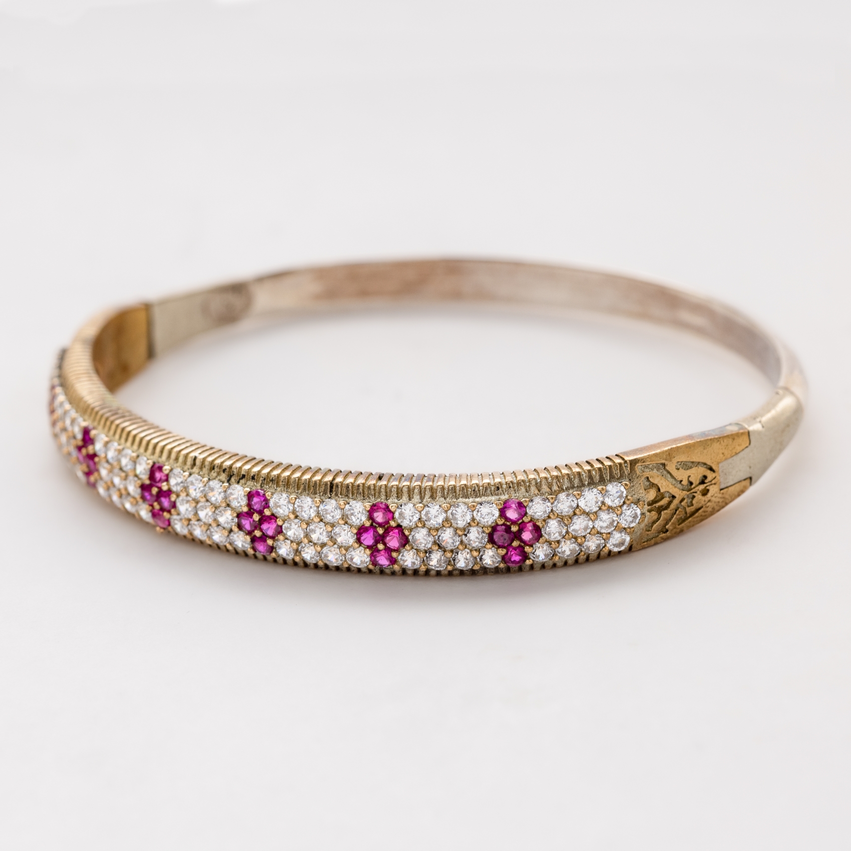 Pulsera esclava en plata dorada con circonitas y símiles de rubí. Estimación:250 – 300€
