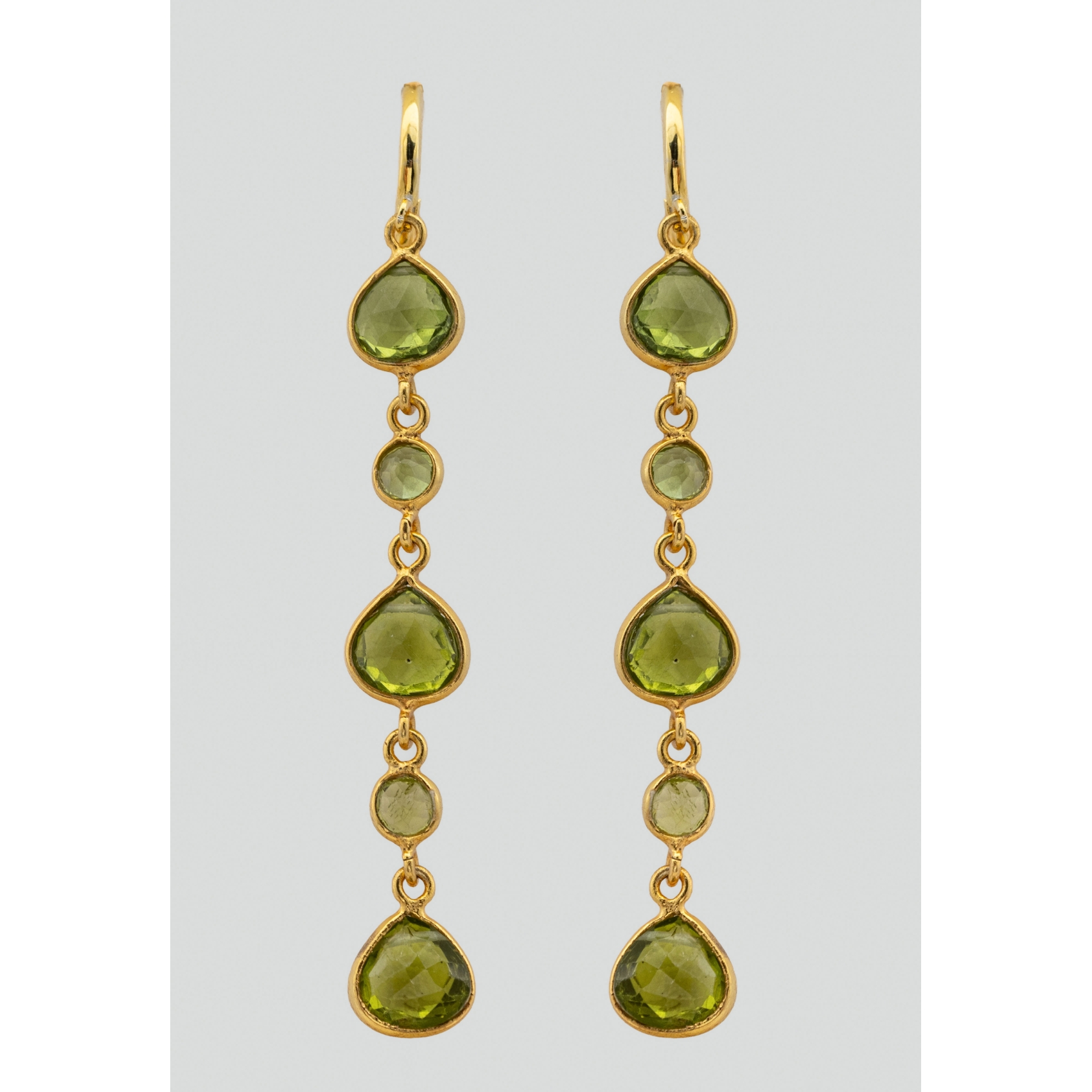 Pendientes largos en plata dorada con peridotos tallas redonda 4 mm y perilla 8 x 7,5 mm. Estimación:120 – 150€