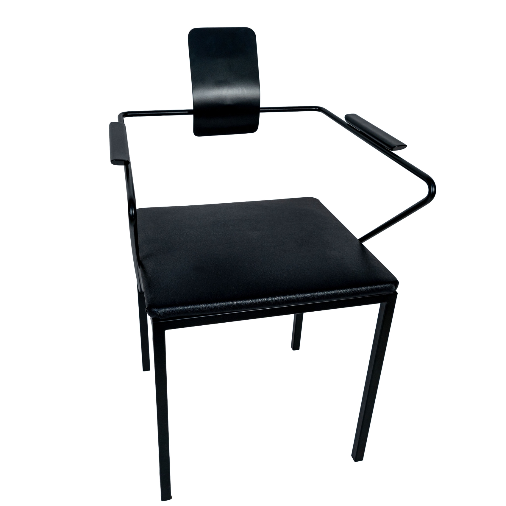 Silla de diseño minimalista postmodernista en tonalidad negro satinado con estructura metálica y tapizada en cuero, s.XX.
