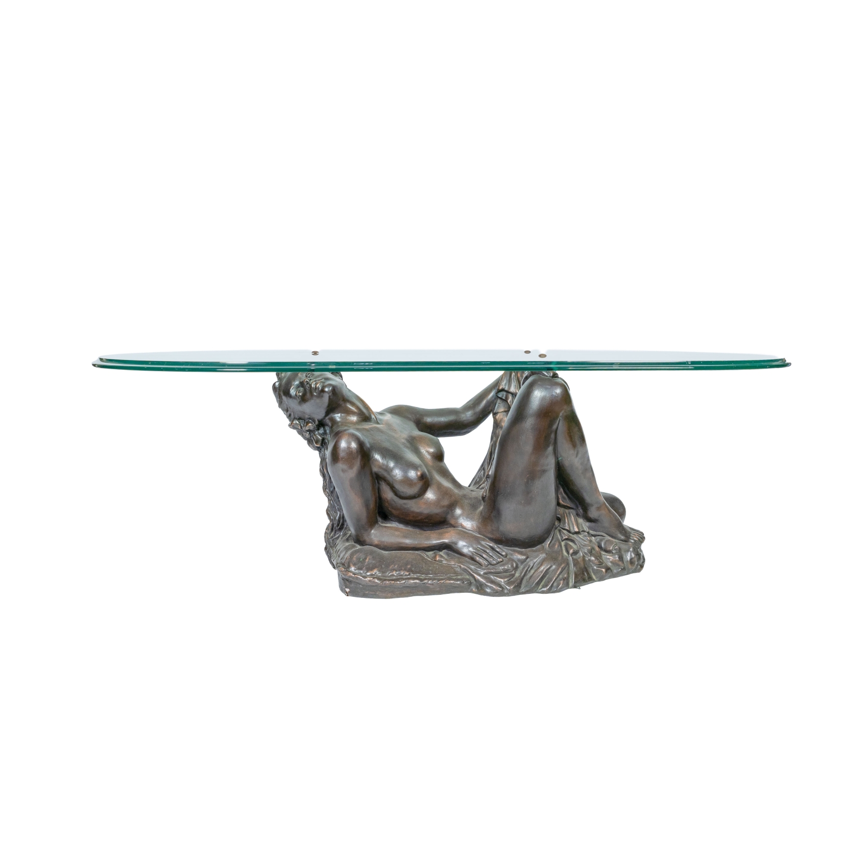 Mesa baja de centro en crisal biselado apoyado sobre figura en símil de bronce de desnudo femenino, s.XX.