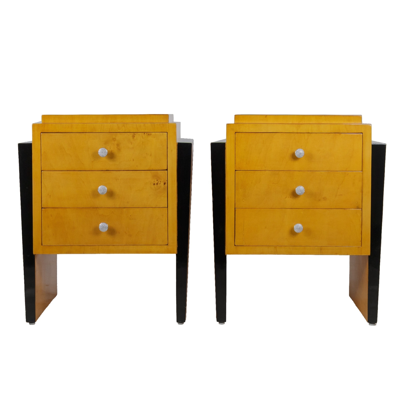 Pareja de mesistas estilo Art Deco en madera chapada y parcialmente ebonizada con tres cajones al frente, s.XX.