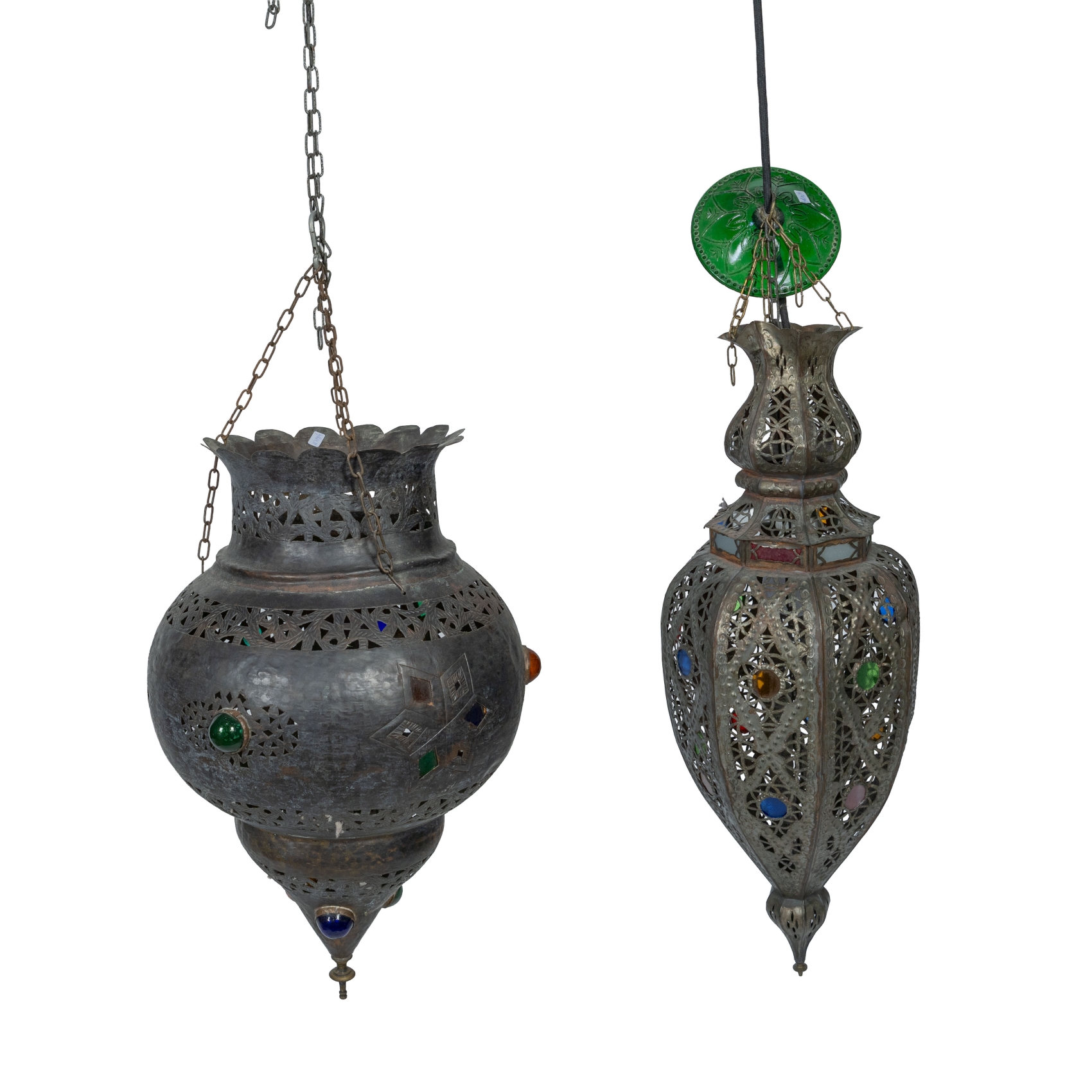 Pareja de lámparas estilo mudéjar en metal con decoración geométrica calada, s.XX.