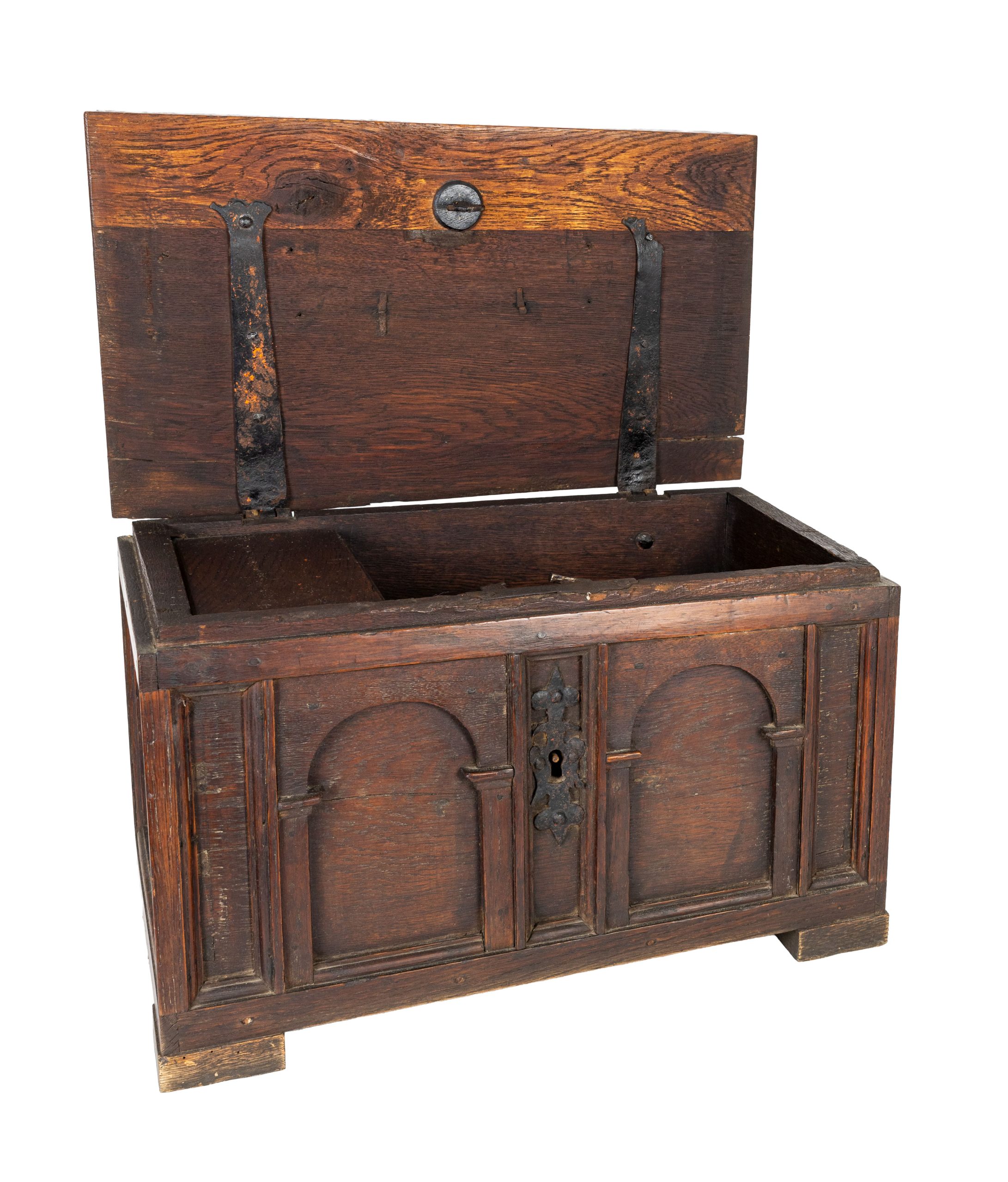 Arcón de viaje en madera de roble con decoraciones arquitectónicas frontales, s.XIX. Herrajes, tiradores y bocallave en hierro. Interior con un compartimento. Sin llave.