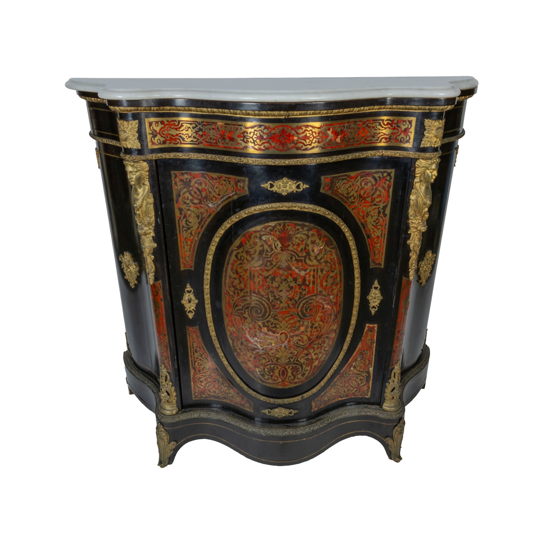 Entredós Napoleon III «boullé» en madera ebonizada y sobre en mármol blanco veteado, fles. del s.XIX-ppios. del s.XX. Arranques, decoraciones y remates en bronce dorado. Sin llave.