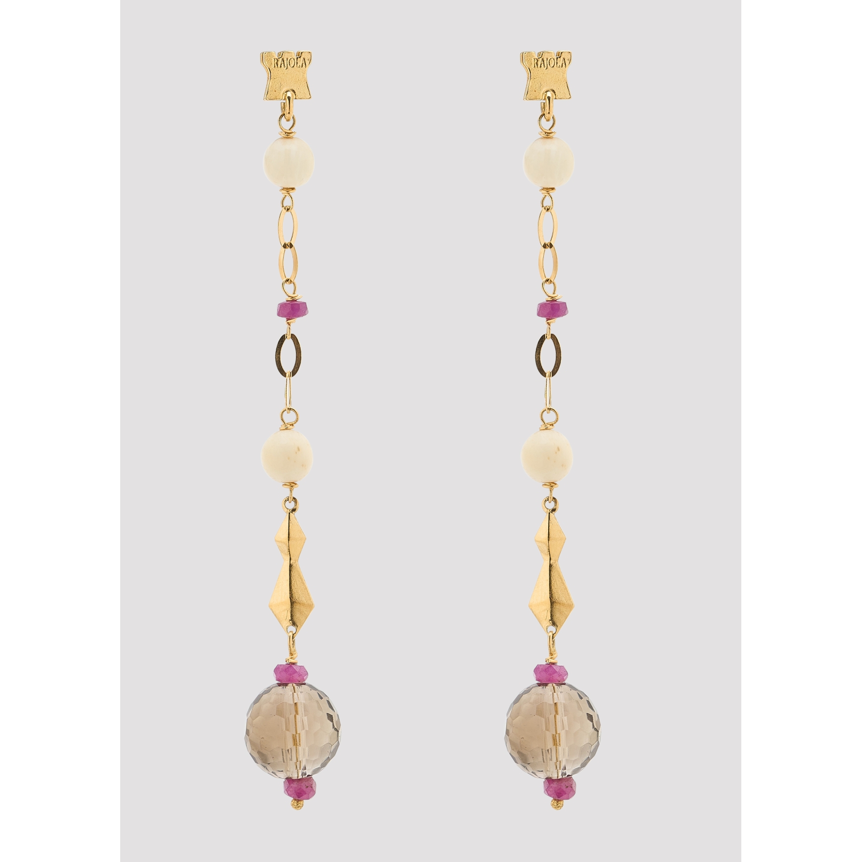 Pendientes largos en oro con cuentas circulares de cuarzo fumé 10 mm, marfilina 5 mm y rubíes de 3 mm.