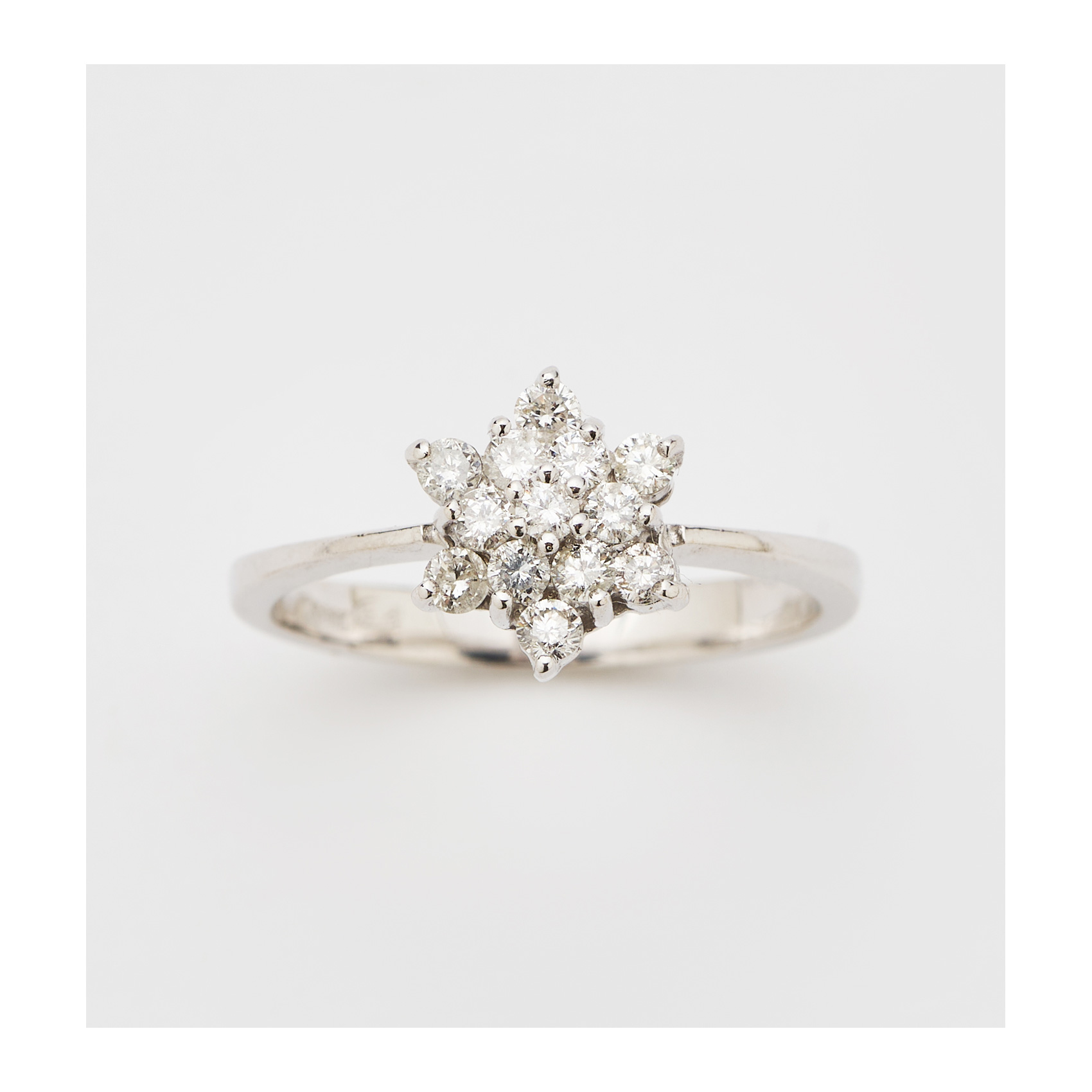 Sortija rosetón en oro blanco con diamantes talla brillante engastados en garras.