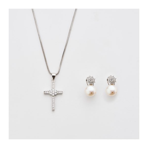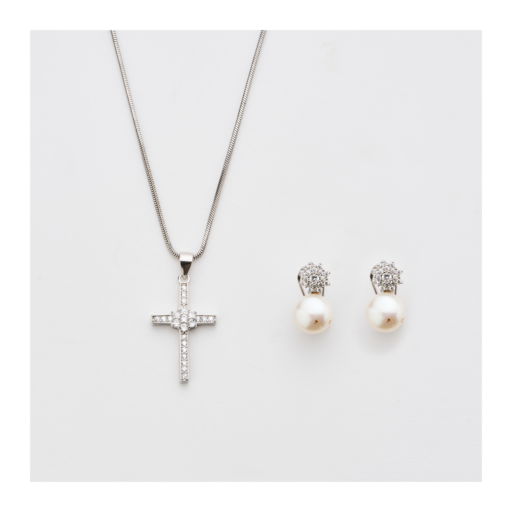 Colgante diseño cruz y pendientes tu y yo en plata con perla botón cultivada de 10 mm. y circonitas.