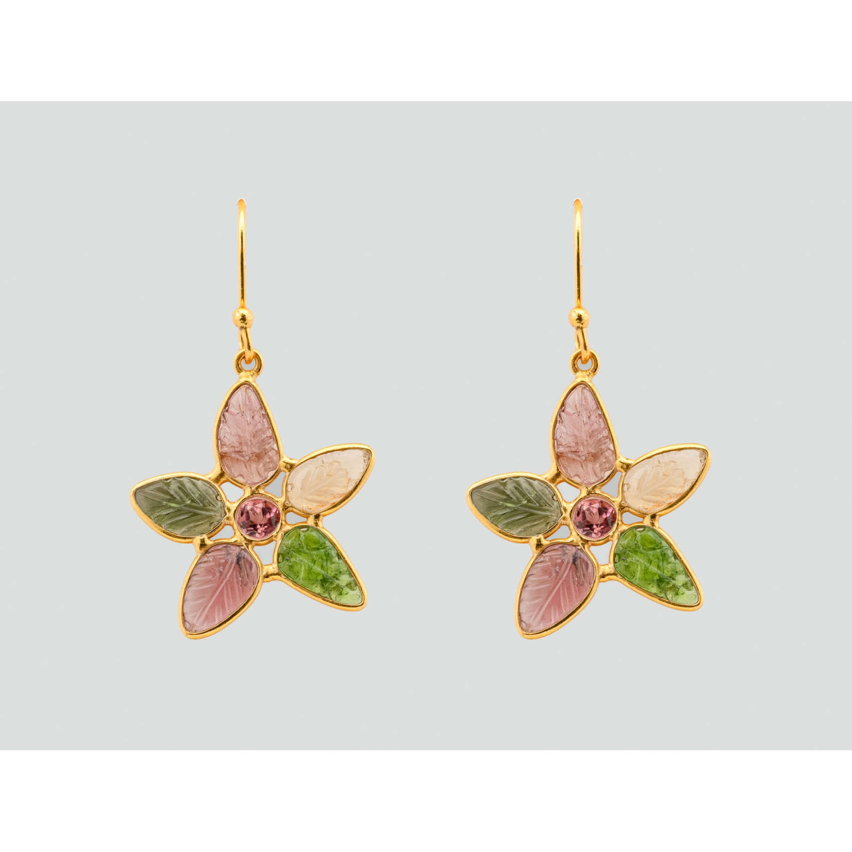 Pendientes diseño flor en plata dorada con hojas de turmalinas multicolor de 7 x 5 mm. Estimación:100 – 130€