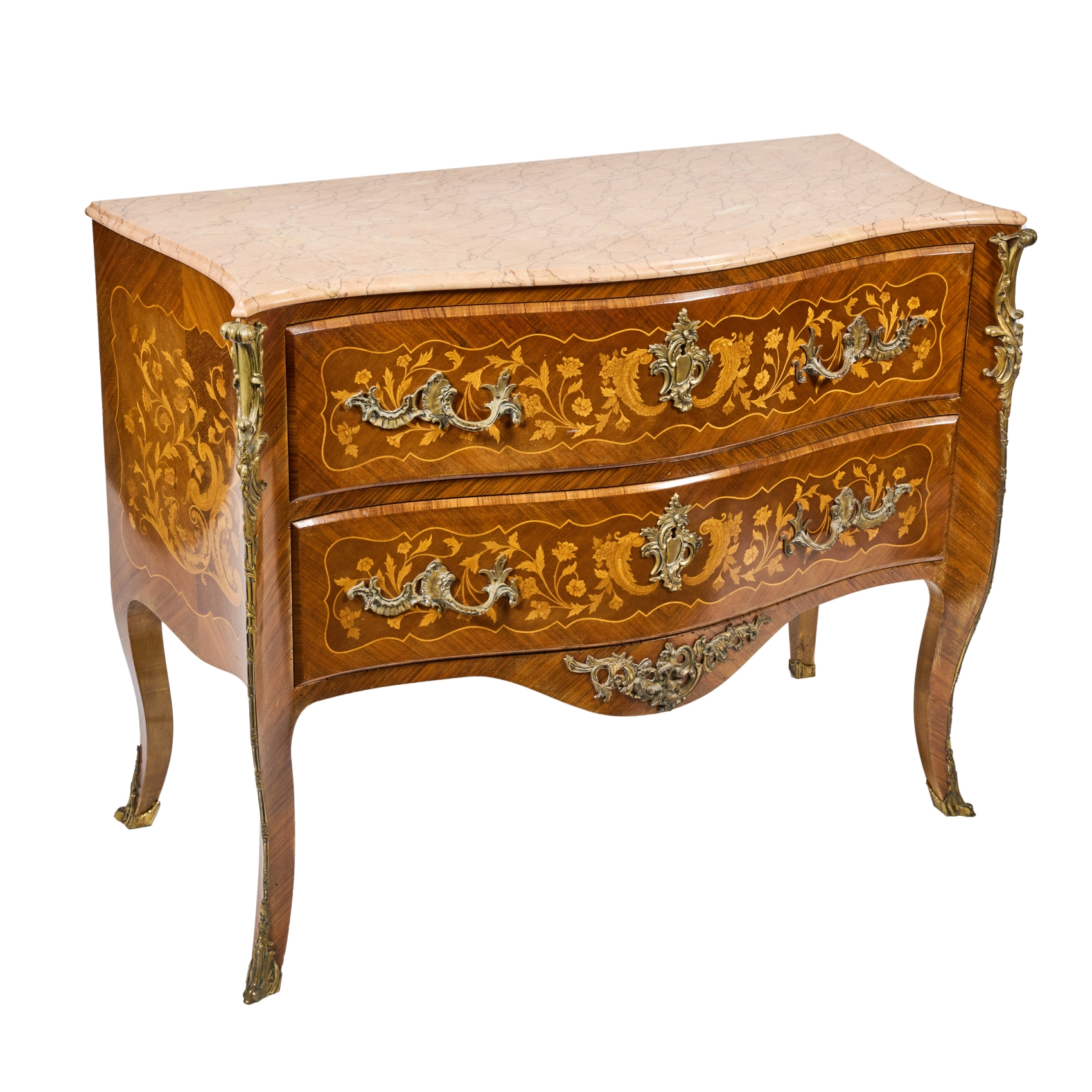 Cómoda «bombé» francesa estilo Luis XV en madera tallada con marquetería en limoncillo de motivos florales y aplicaciones en bronce de roleos y rocallas, ppios. del s.XX. Presenta dos cajones al frente y sobre en mármol rosa veteado. Adjunta llave.