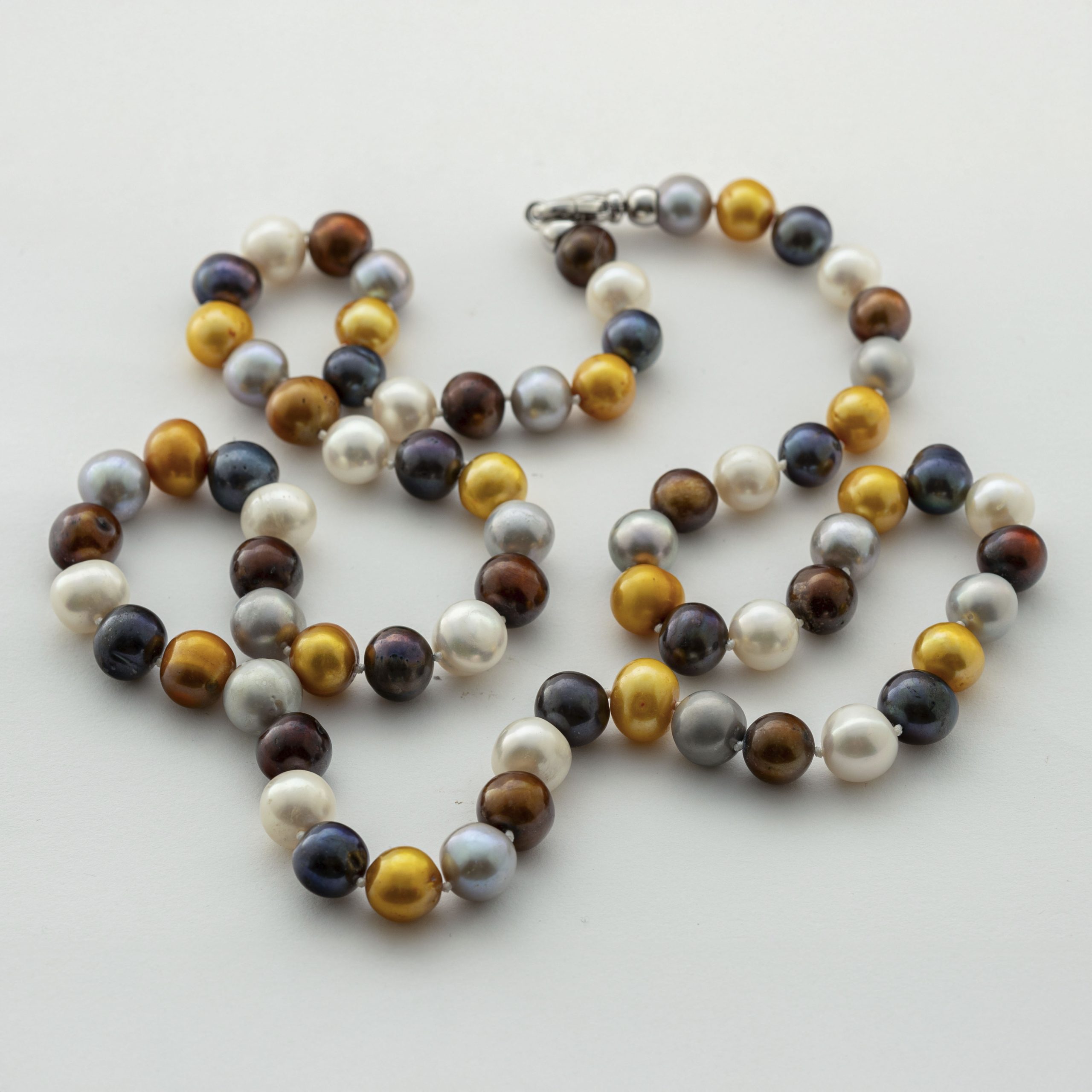 Collar de perlas cultivadas de agua dulce 11-9 mm. en color blanco, golden, gris pálido, chocolate y gris antracita con cierre mosquetón en plata.