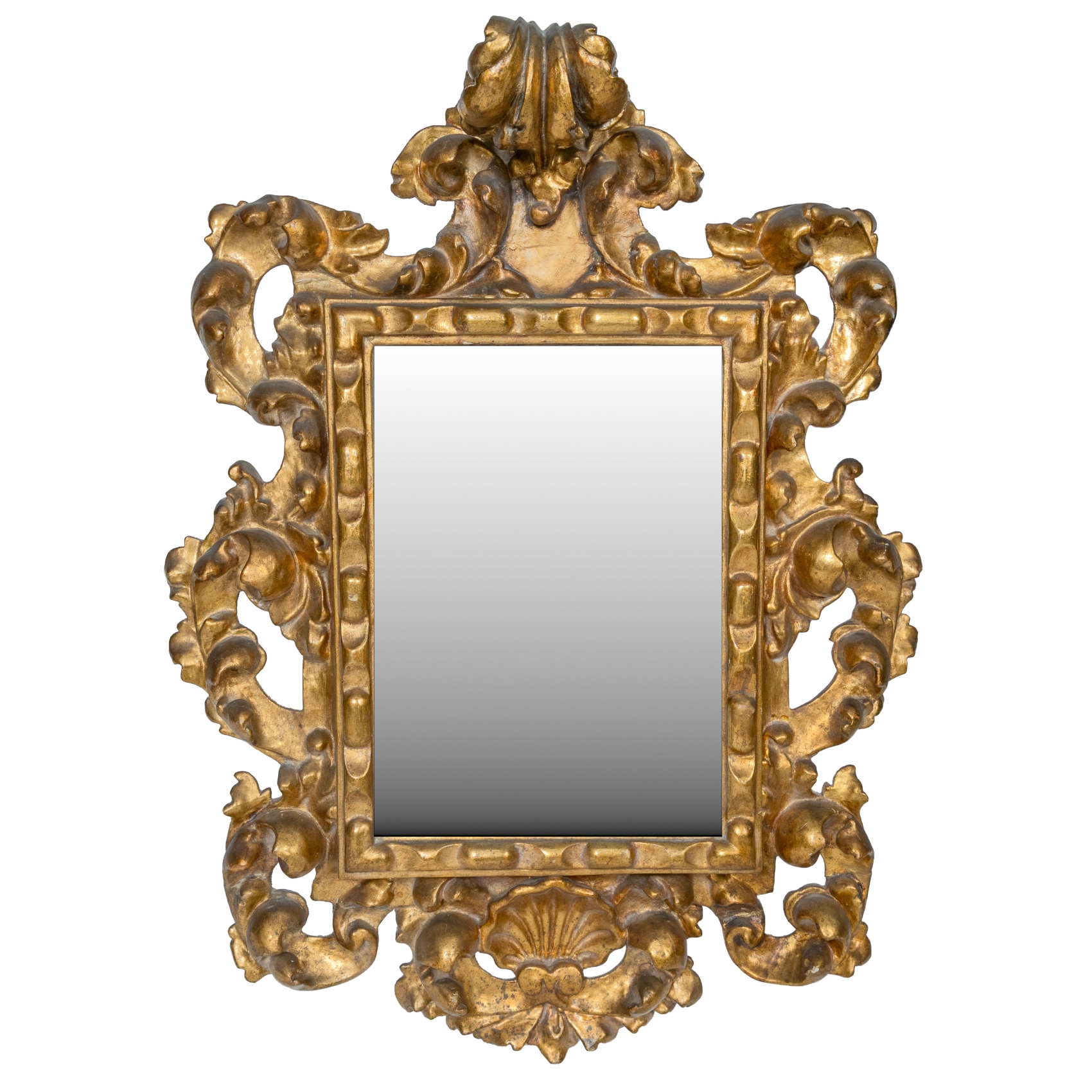 Espejo en madera tallada y dorada con motivos decorativos de roleos, rocallas y pequeño copete, s.XIX.
