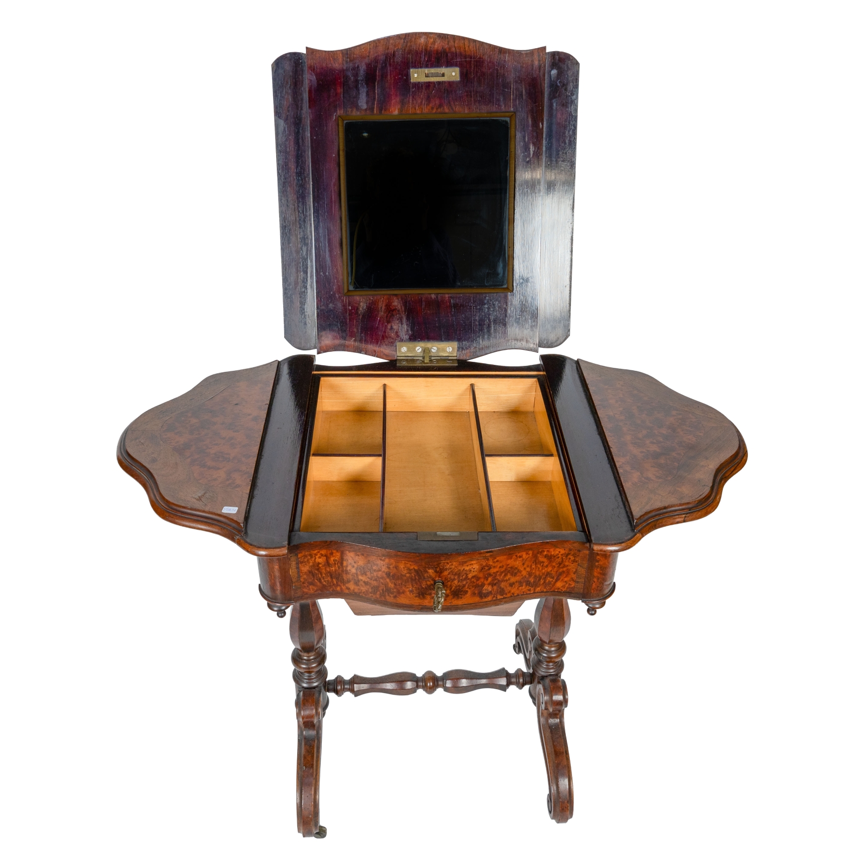 Mesita costurera con alas abatibles en madera de raiz de nogal, cajón central compartimentado y patas rematadas con ruedas, s.XIX. Adjunta llave.