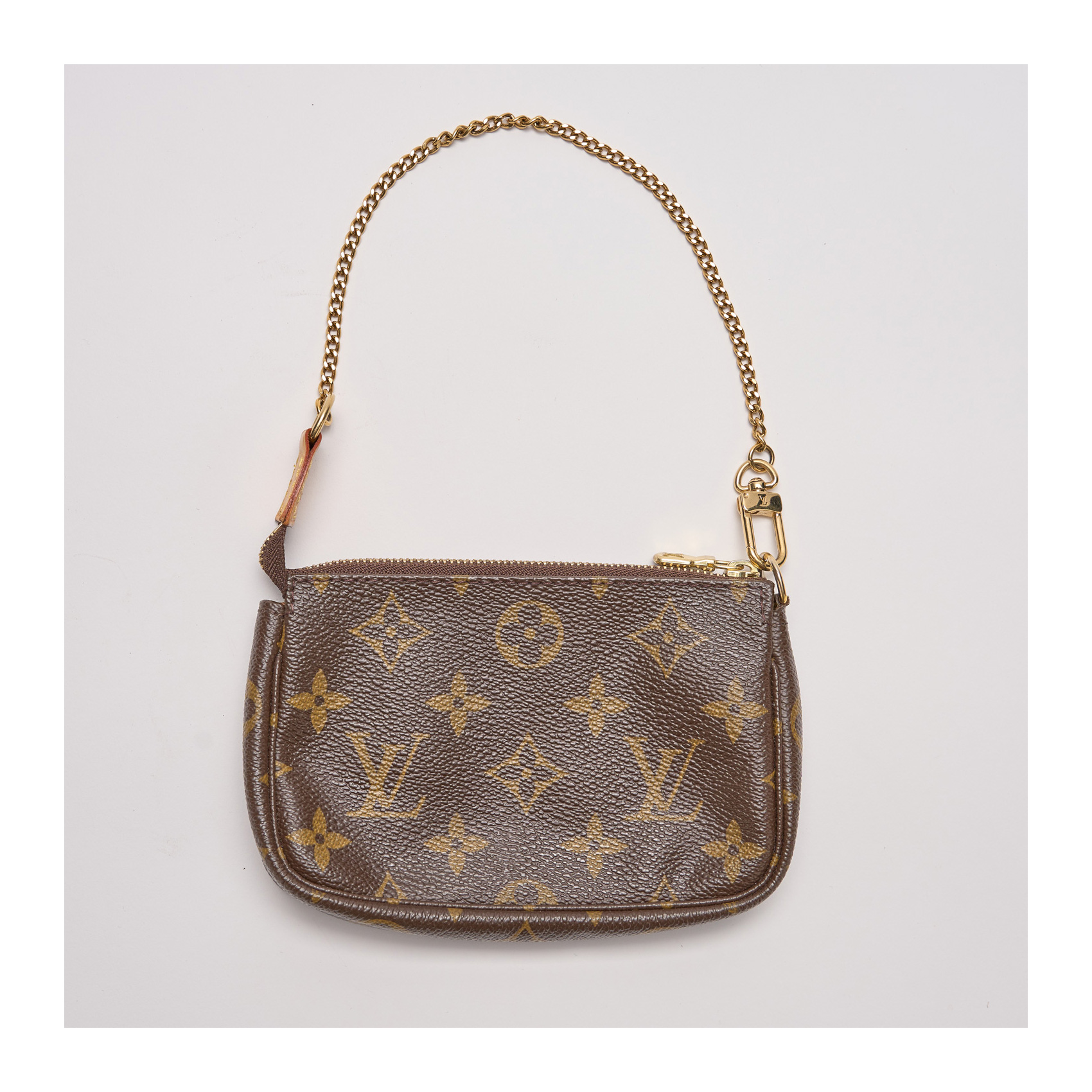 LOUIS VUITTON. Cartera de mano modelo «Mini Pochette Accessories» en piel marrón con estampado Monogram y cierre de cremallera. En muy buen estado. Ref.:DU1006.