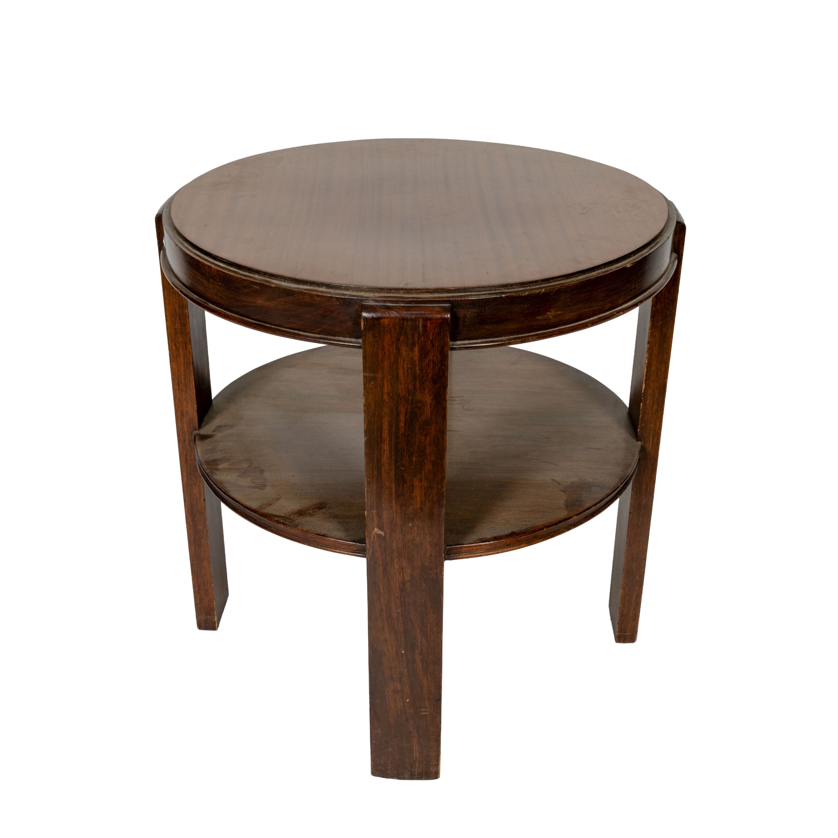 Mesita circular Art Deco en madera de sapeli con un estante inferior, c.1930.