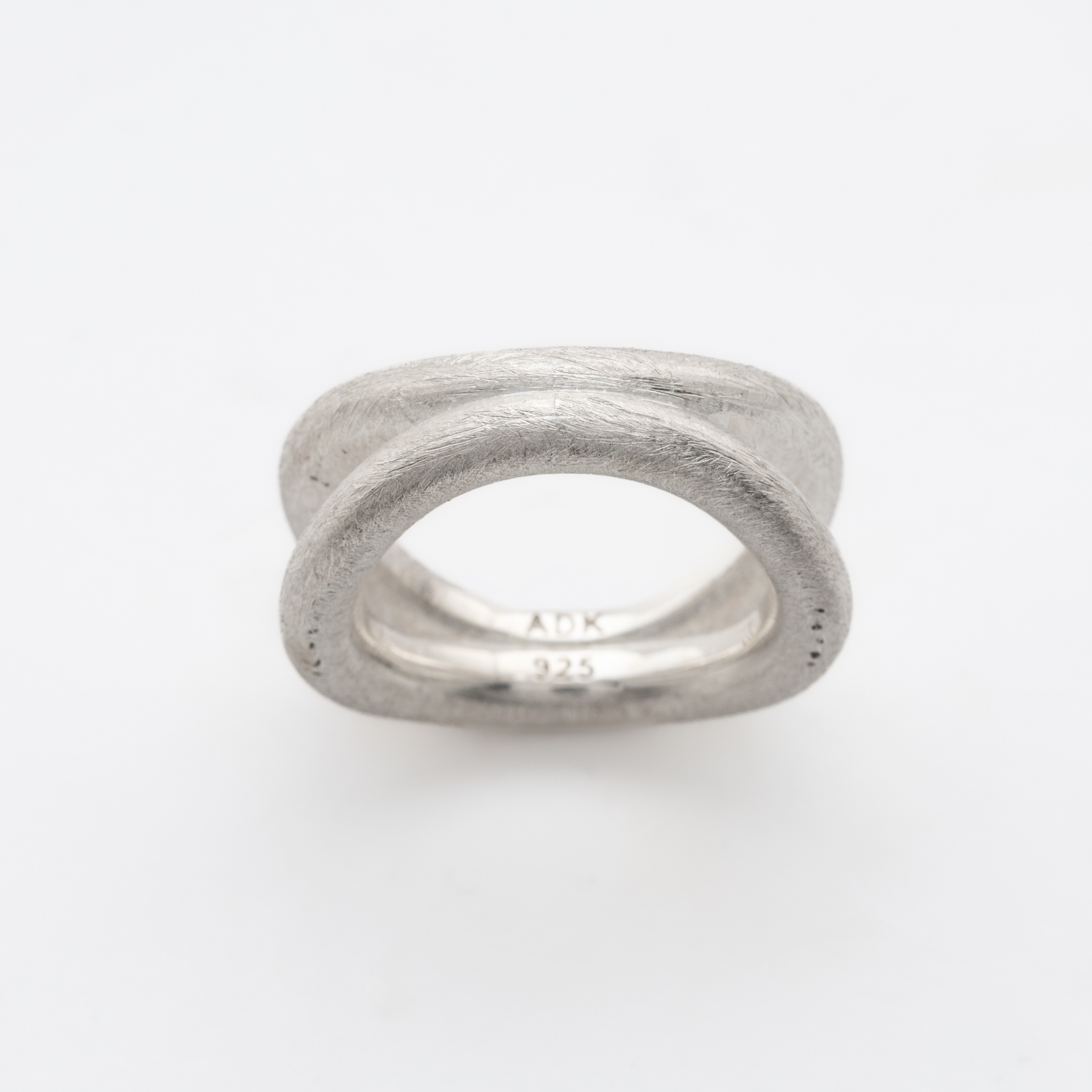 Sortija en plata con acabado mate texturizado formada por dos aros que convergen y bifurcan a tramos regulares.