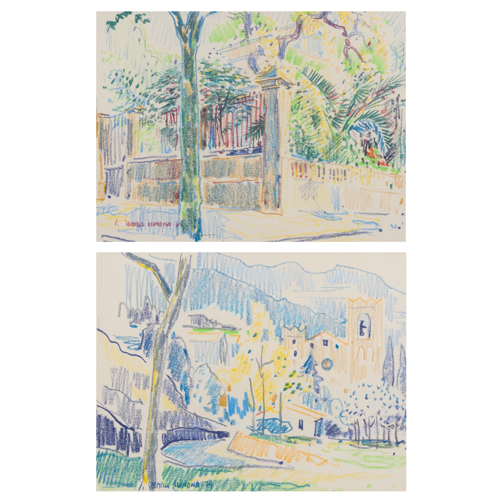 Pareja de dibujos a ceras y lápices de colores sobre papel. Firmados y fechados en 1979.