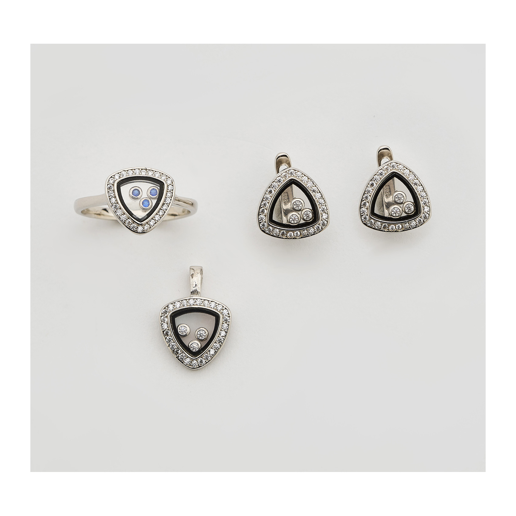 Juego de colgante, pendientes y sortija estilo Chopard en plata, esmalte y circonitas.