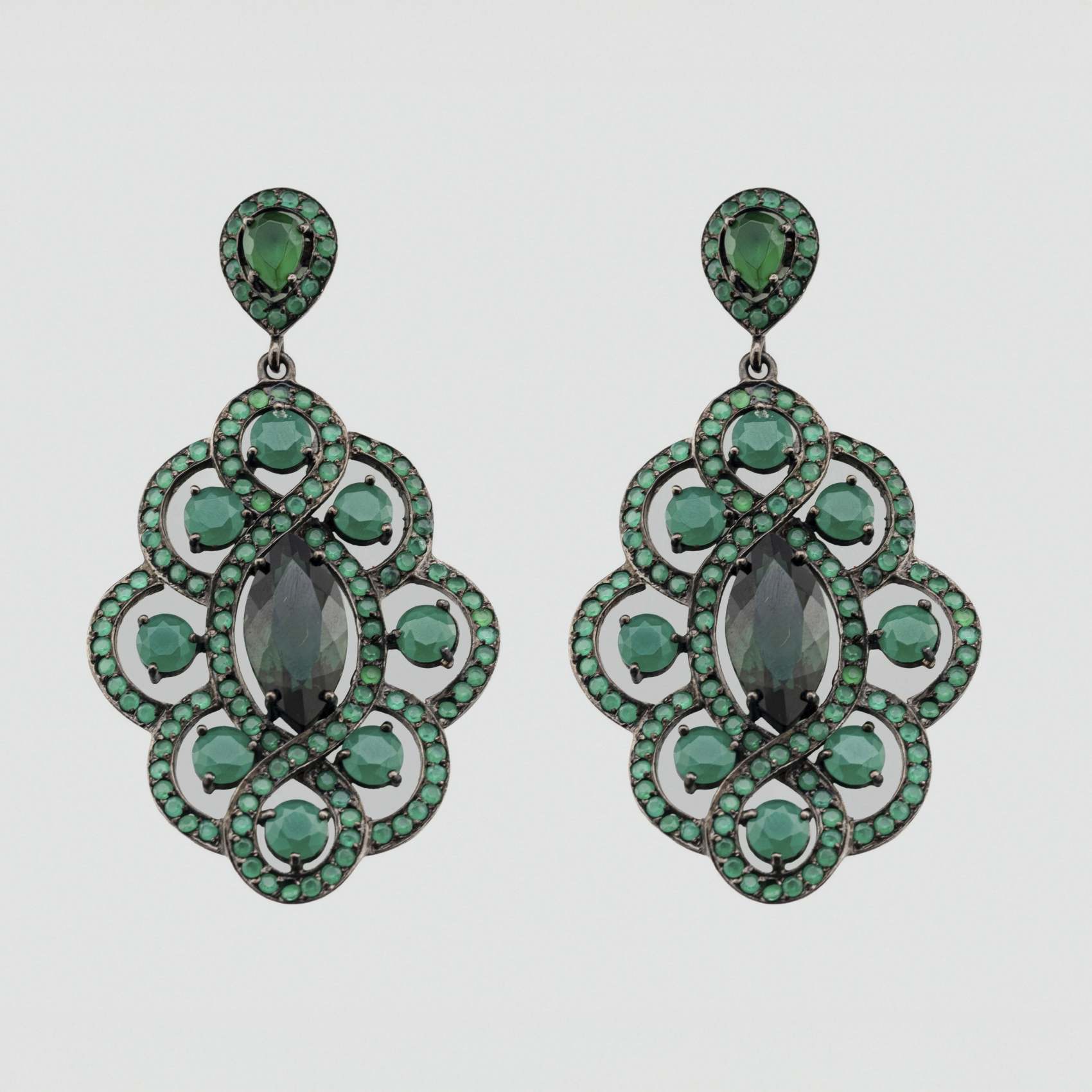 Pendientes largos calados en plata pavonada con cuarzos verdes tratados tallas redonda y marquise, 20 x 10 y 8 x 6 mm.