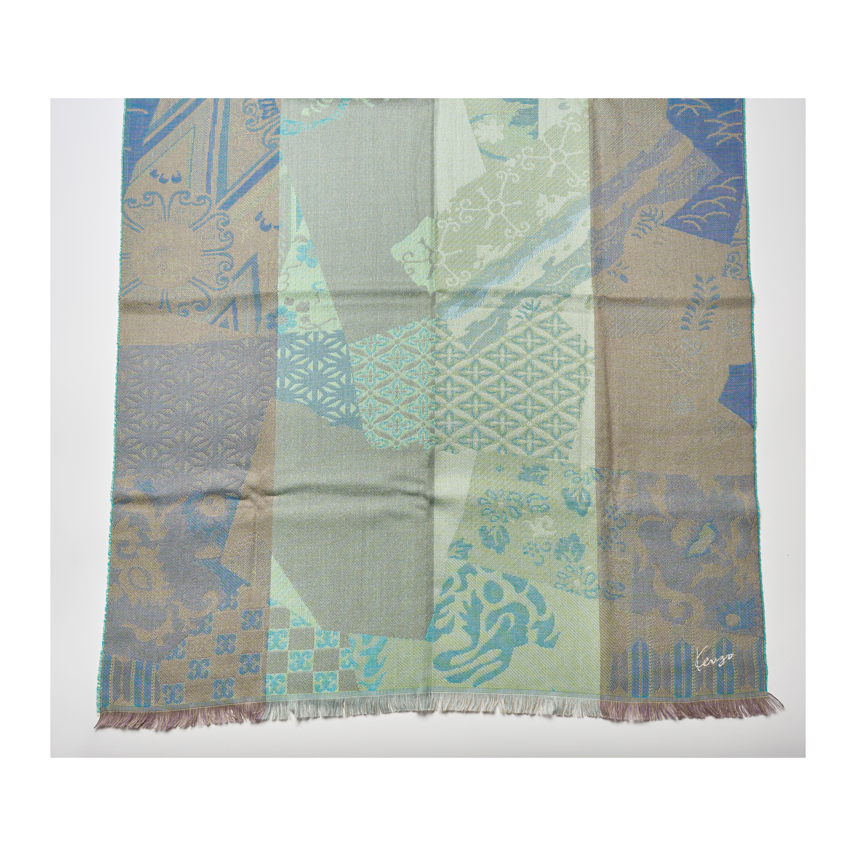 KENZO. Foulard en lana, seda y algodón en tonalidades verdes y azuladas con estampado de motivos florales y geométricos. En perfecto estado.