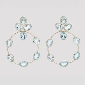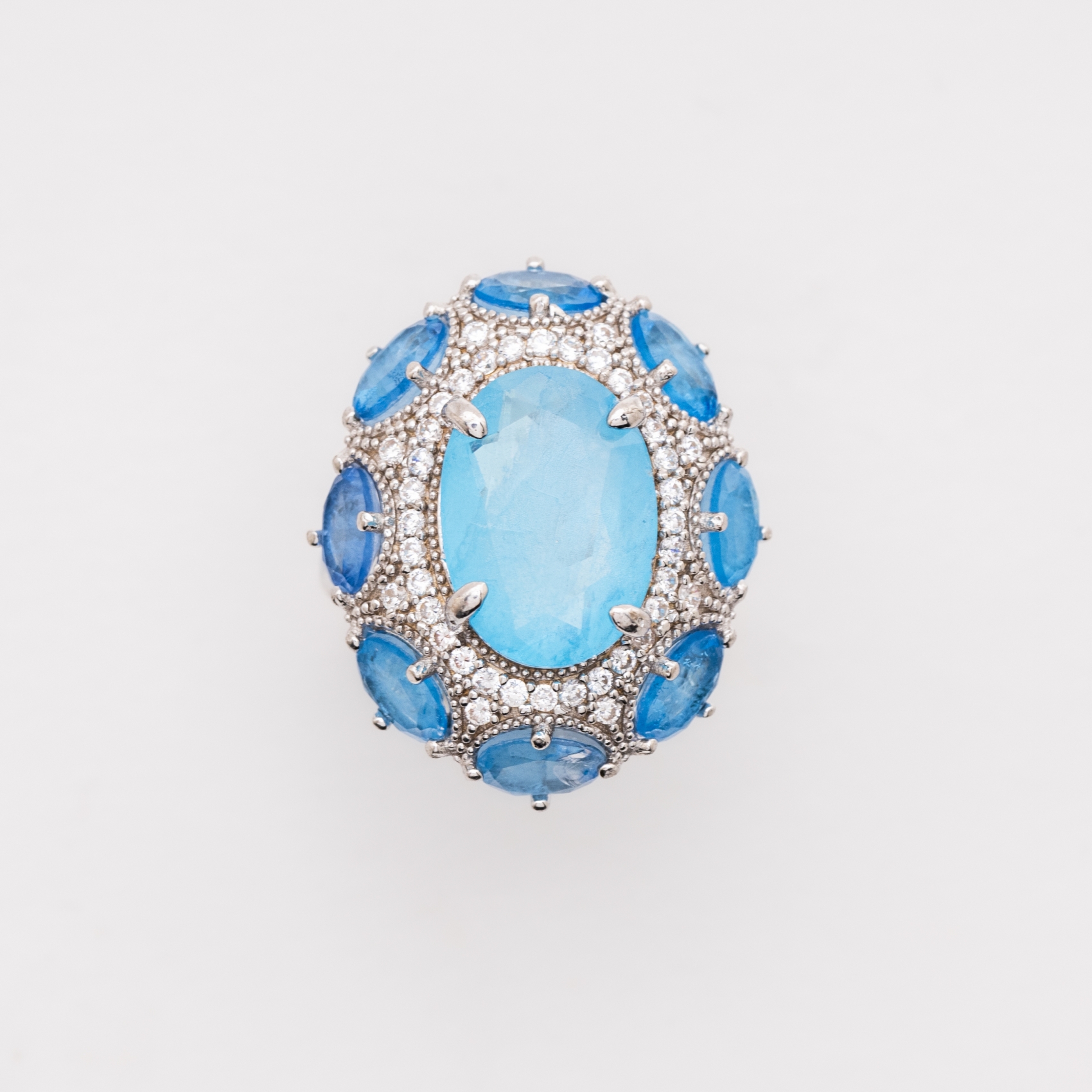 Sortija rosetón en plata rodiada con piedras ornamentales talla oval en color azul de 14 x 10 y 5 x 3 mm. y circonitas.