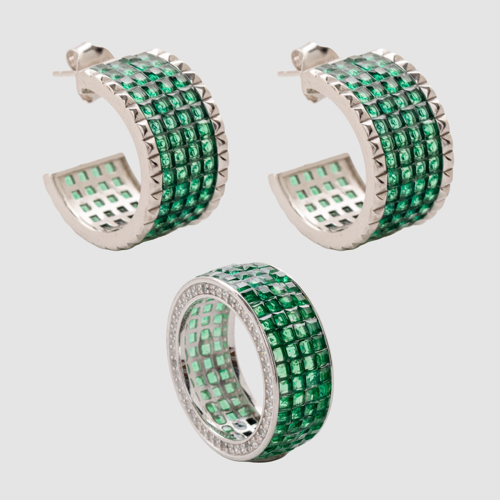 Juego de pendientes criolla y sortija en plata rodiada con símiles de esmeralda talla princesa y circonitas.