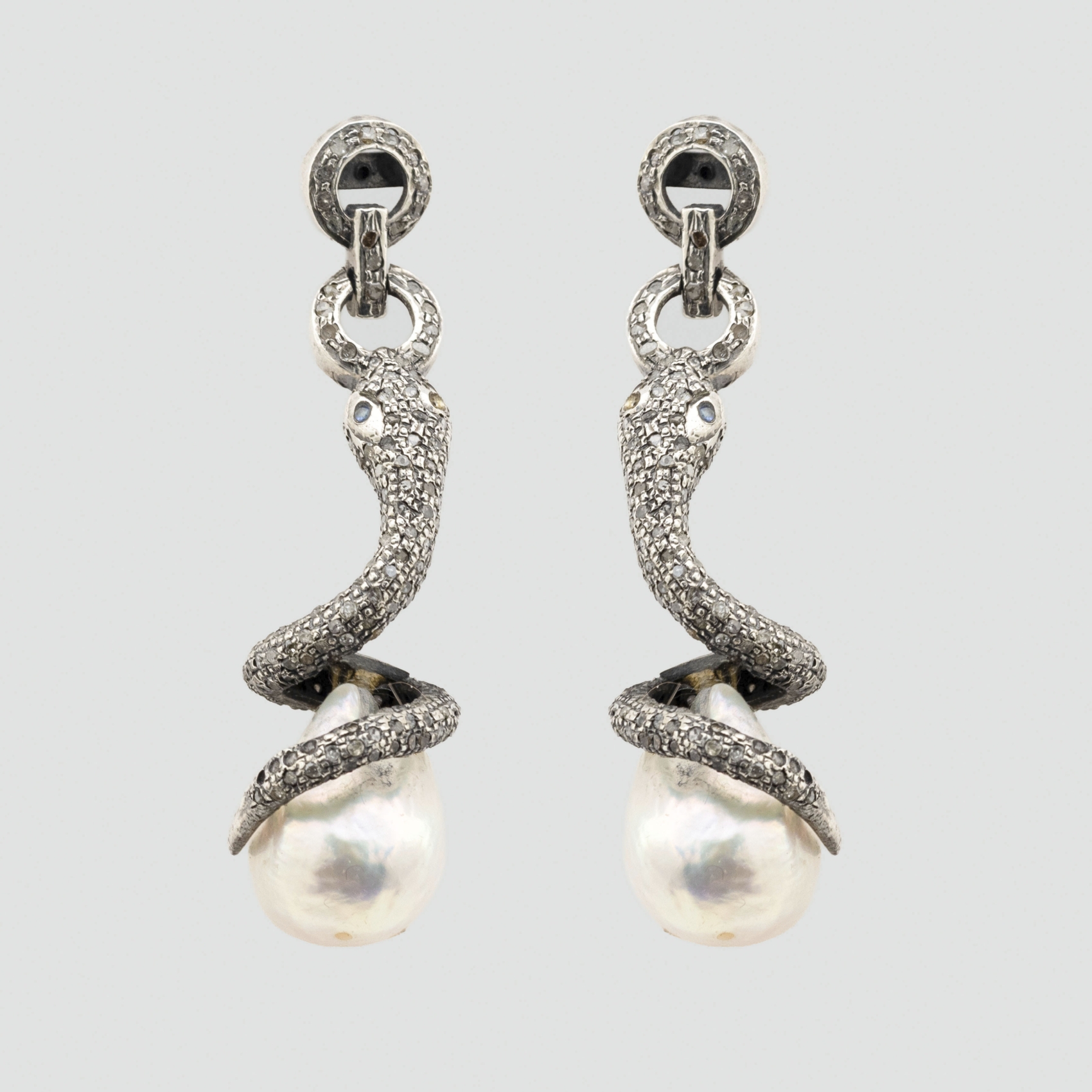 Pendientes diseño serpiente en plata con perla barroca de 16 x 12 mm y diamantes talla rosa.