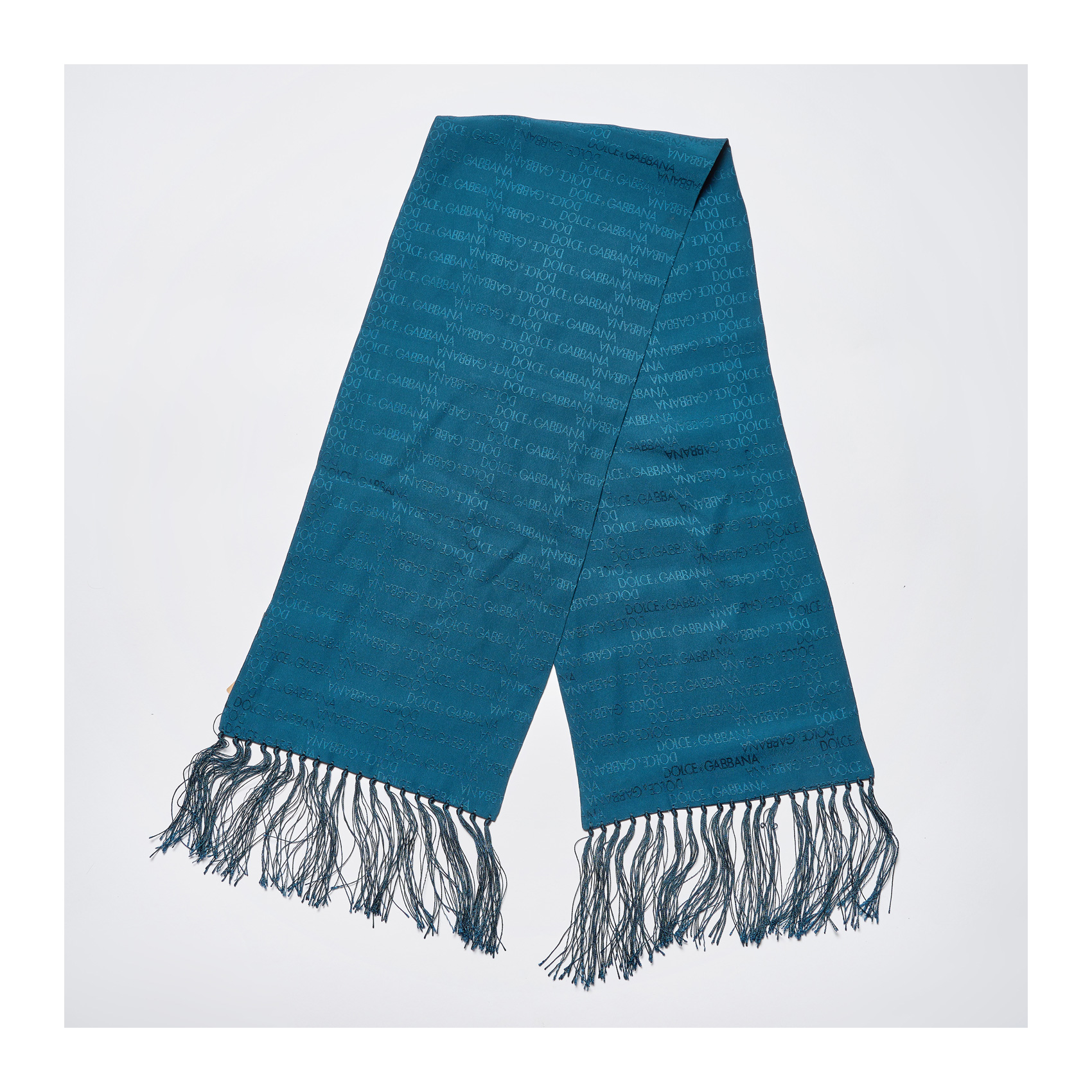 DOLCE & GABBANA. Estola en seda de tonalidad azul marengo con estampado de repetición del anagrama de la firma rematado por flecos. En perfecto estado.