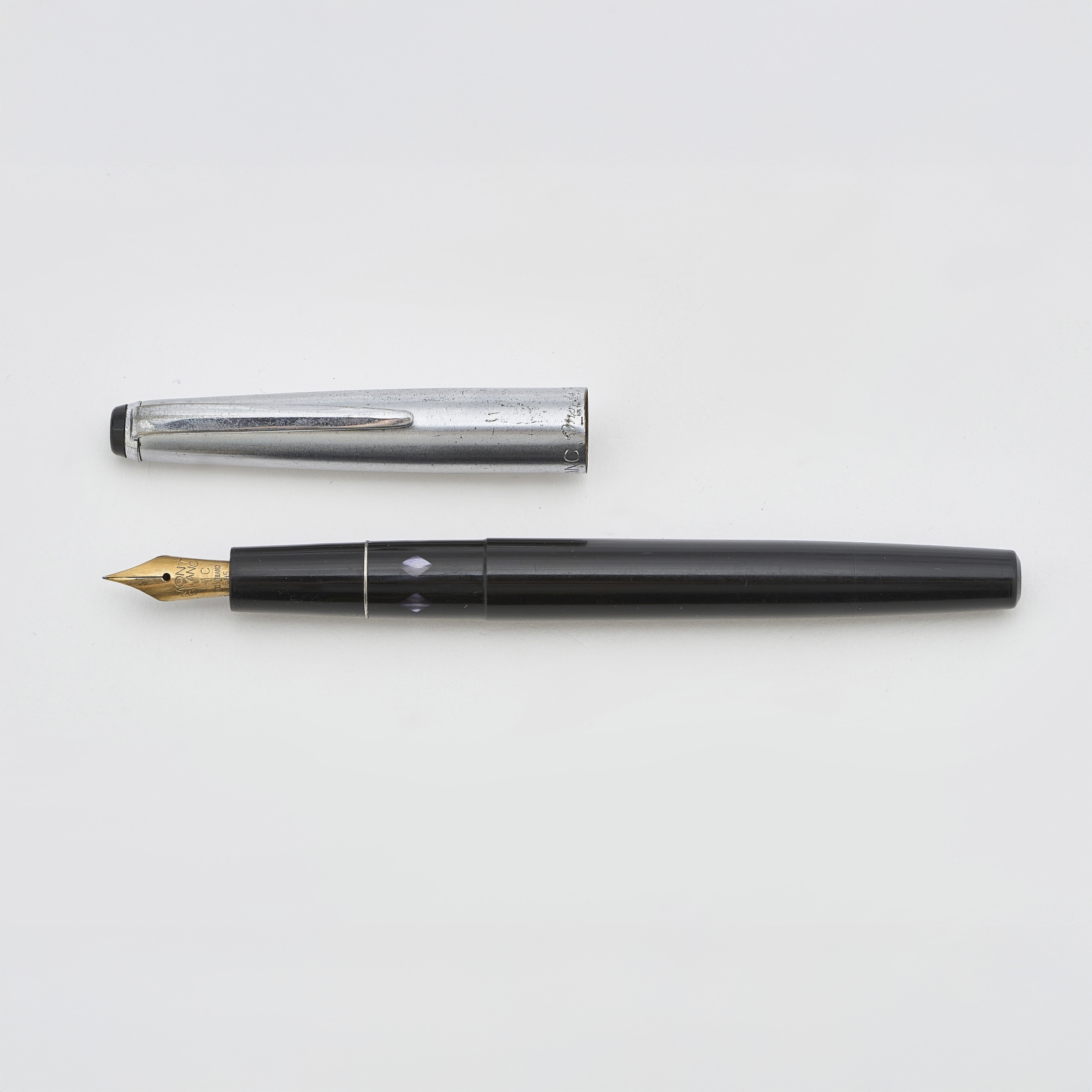 MONTBLANC «Monte Rosa». Estilográfica en resina negra y acero mateado con detalles en plaqué oro. Plumín en oro 14K. Sistema de carga por émbolo. Estimación:140 – 180€