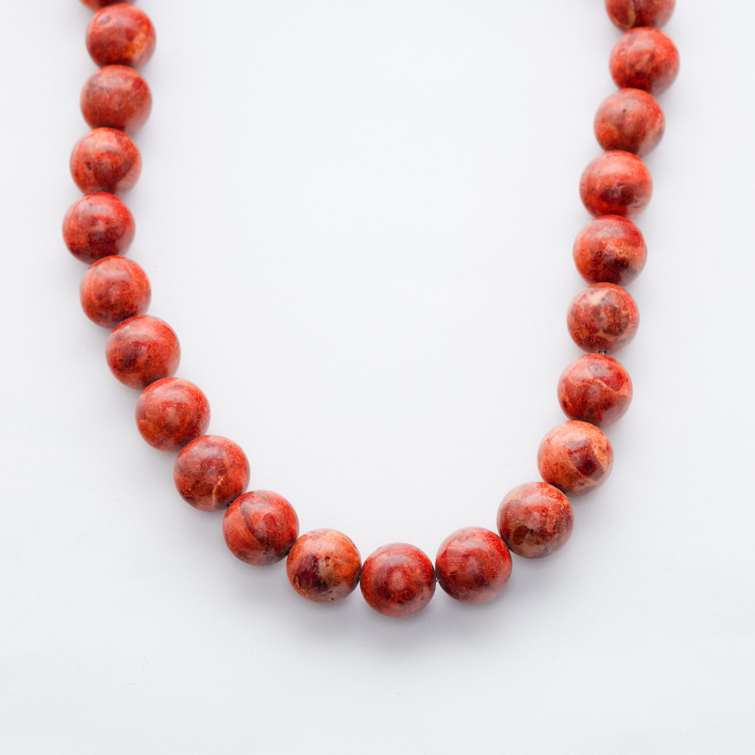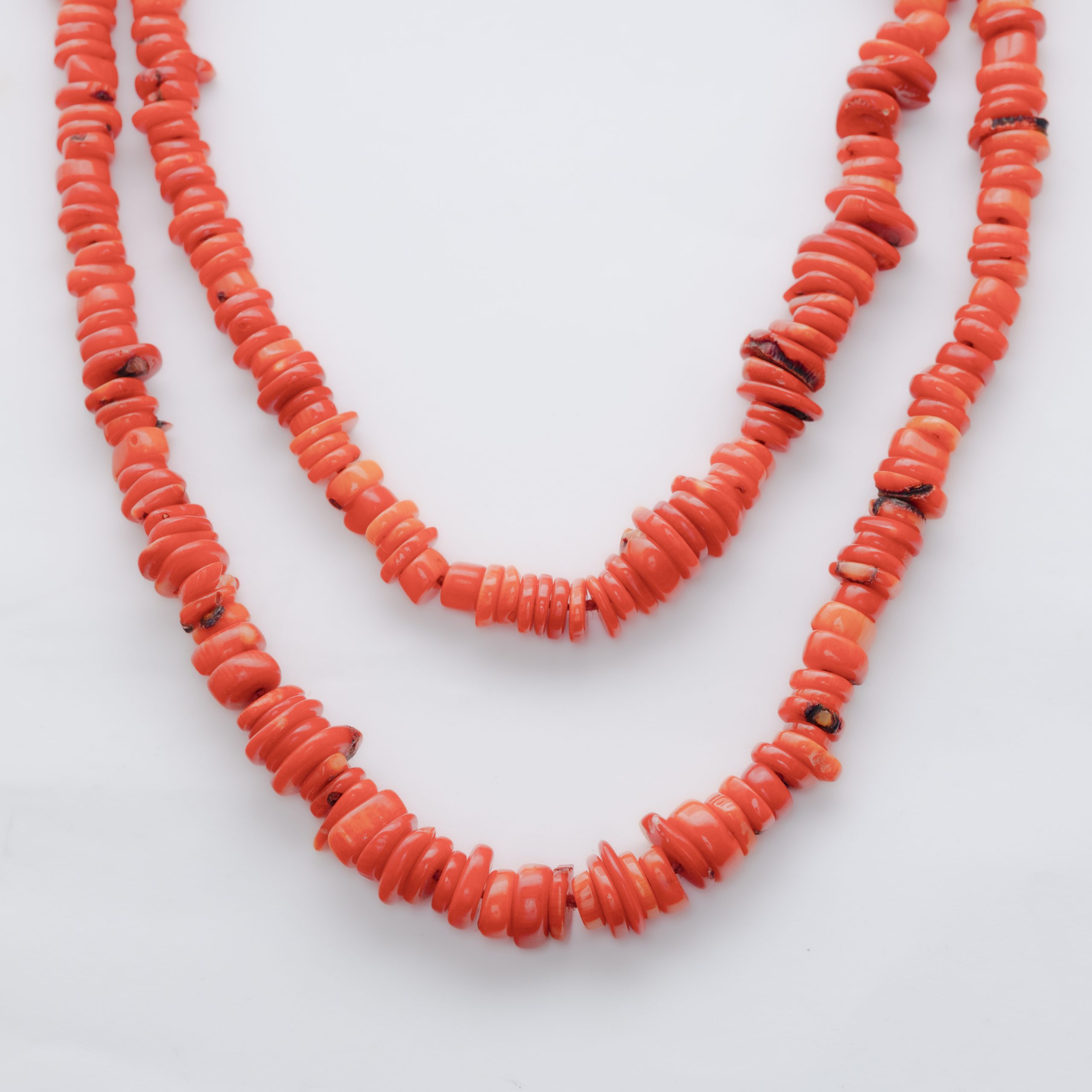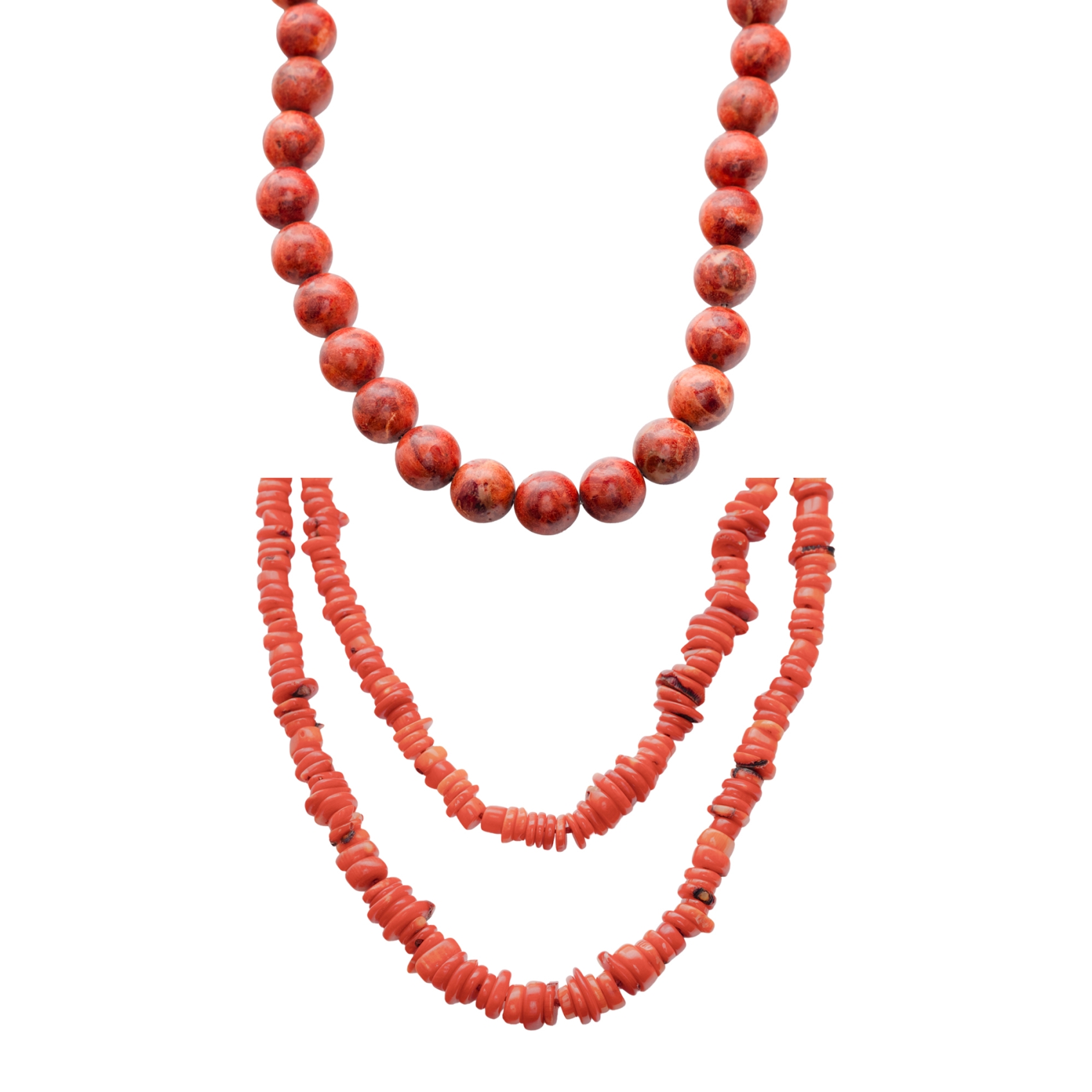 Lote de dos collares, uno de coral bamboo con cuentas esféricas de 14 mm. Y el segundo con cuentas tipo rondelle de coral del Mediterráneo de 6 a 9 mm. Cierres de gancho y reasa en plata.