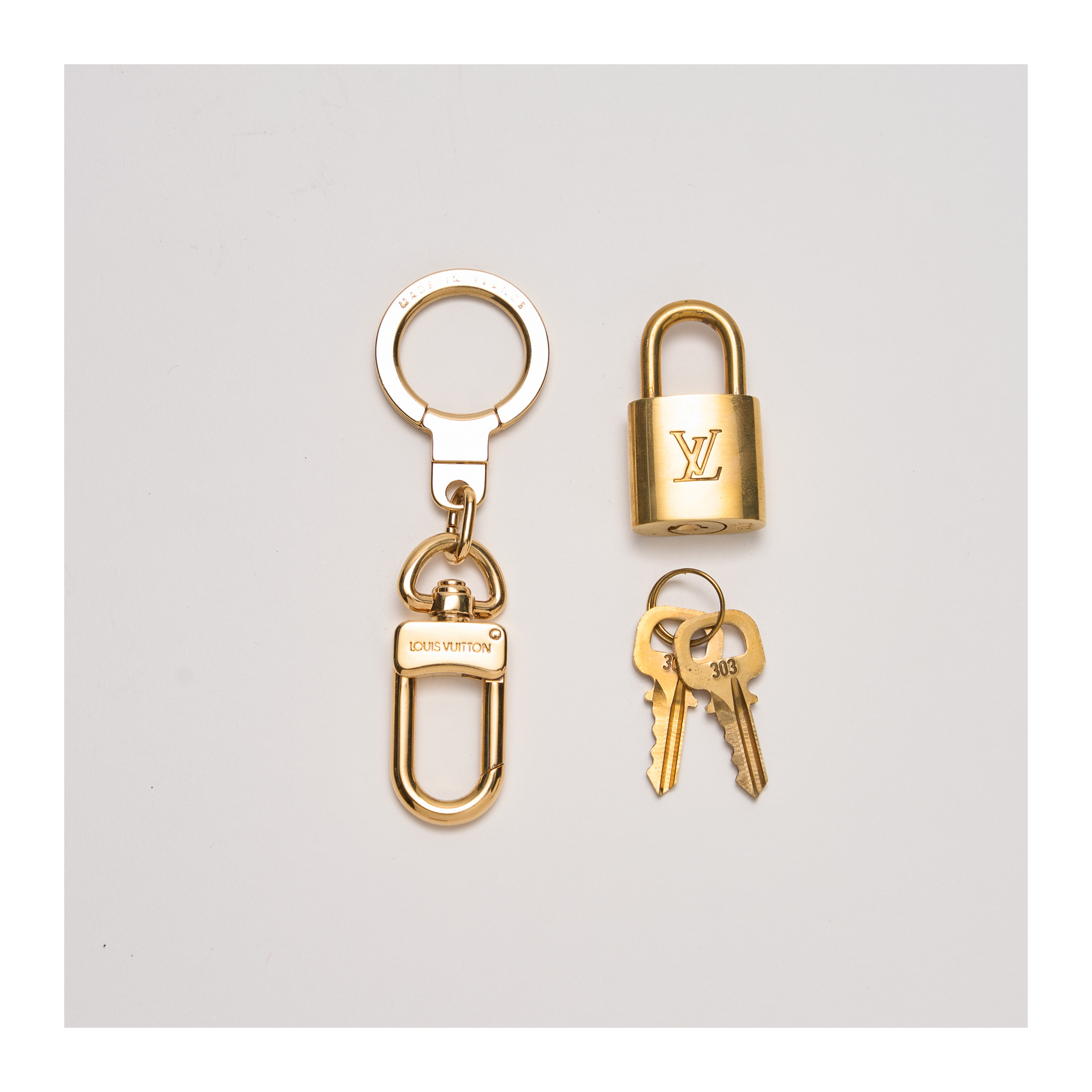 LOUIS VUITTON. Lote de llavero y candado logotipados en latón dorado pulido. En perfecto estado.