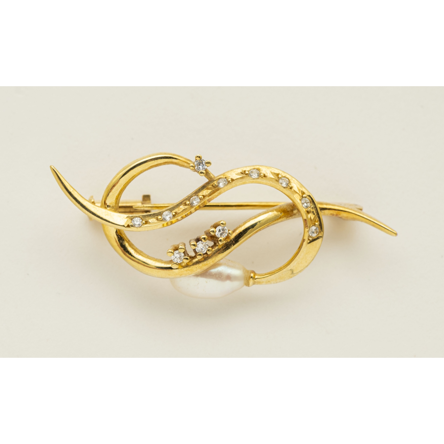 Broche en oro con perla de agua dulce de 5 mm. y circonitas, 4,5 cm.