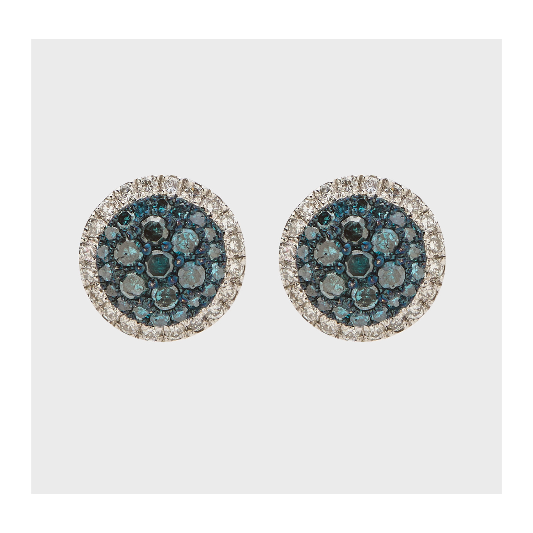Pendientes diseño circular en oro blanco con centro de zafiros azules talla redonda y orlados por diamantes talla brillante.