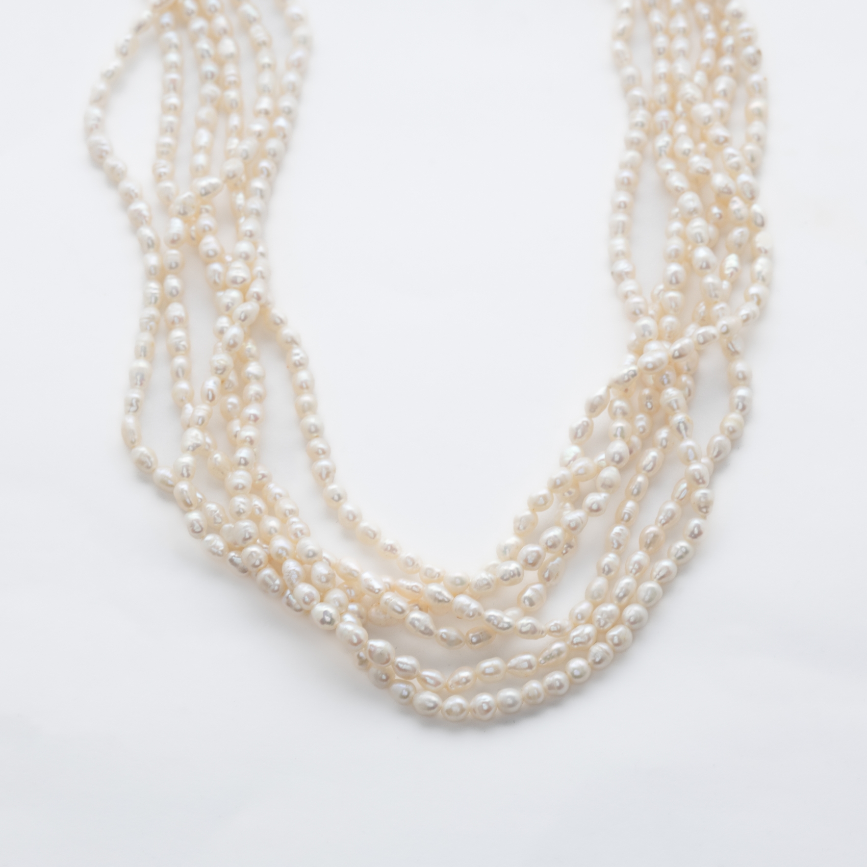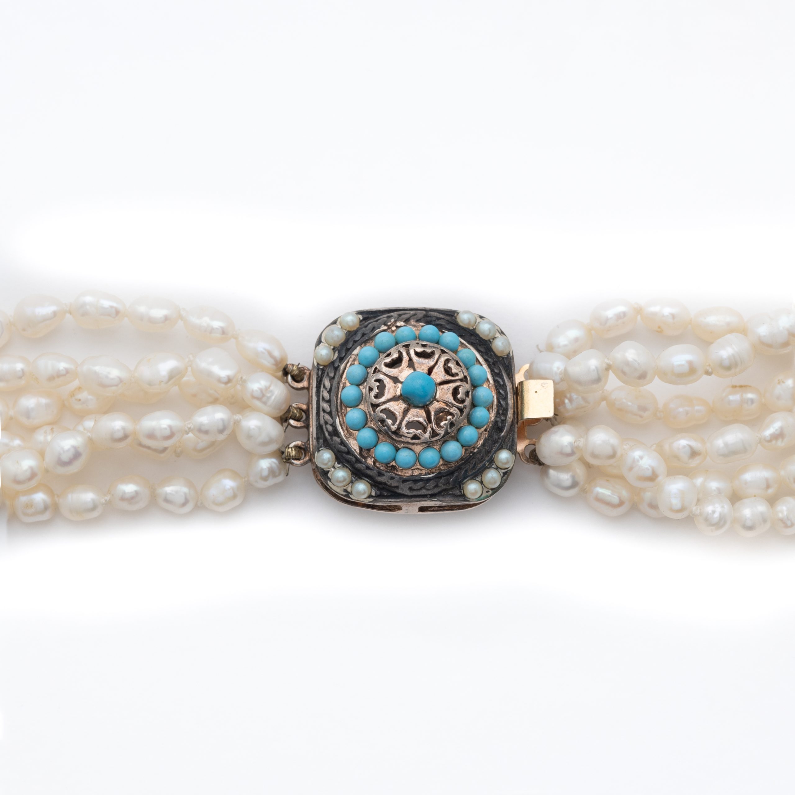 Collar con seis hilos de perlas de agua dulce de 5 x 4 mm y cierre cuadrado en plata, 2 x 2 cm. con cuentas de turquesa de 2 y 3 mm. y perlas de aljofar.