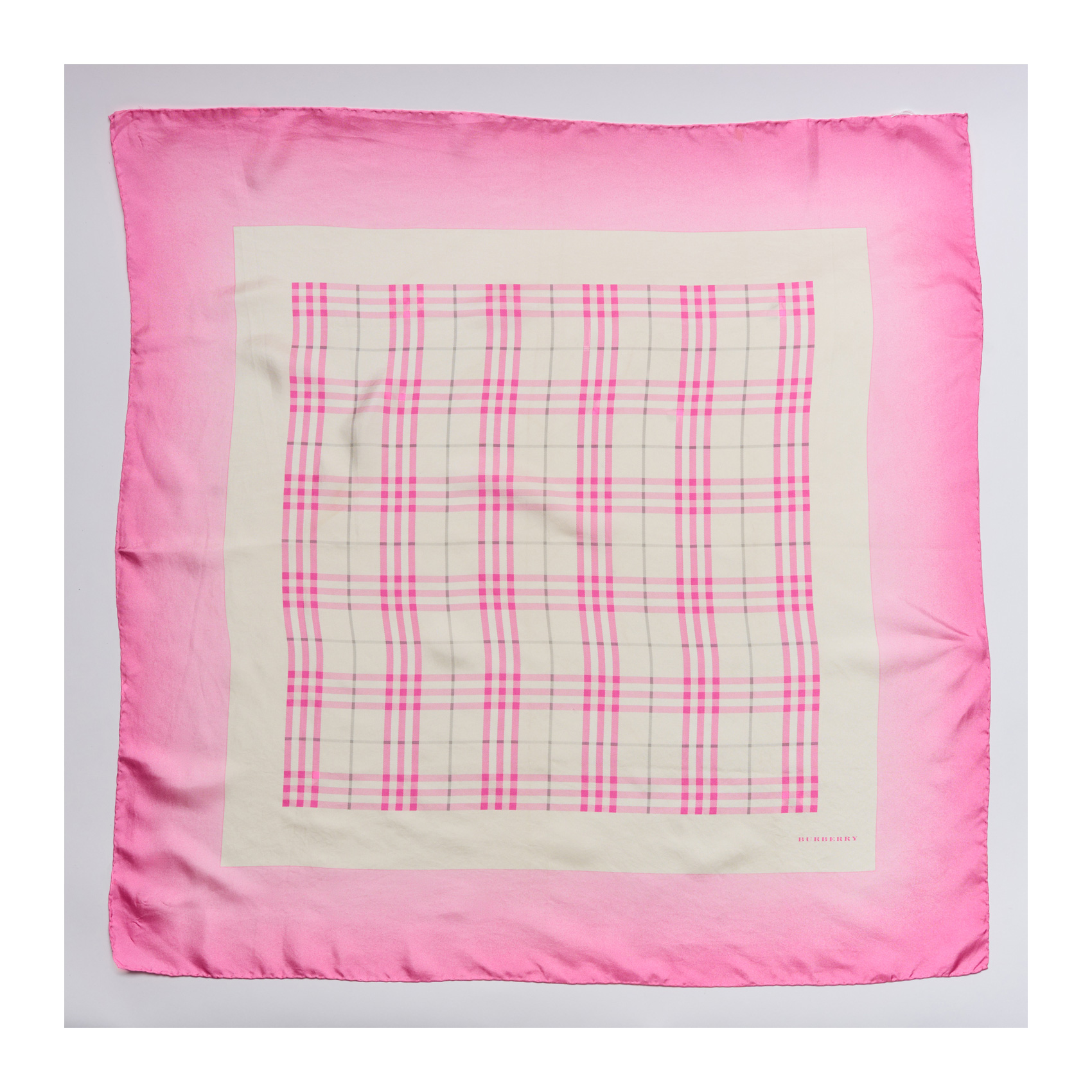 BURBERRY. Pañuelo en seda de tonalidad rosa fucsia y crema con estampado a cuadros. En perfecto estado.