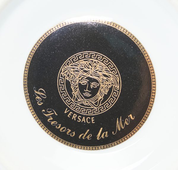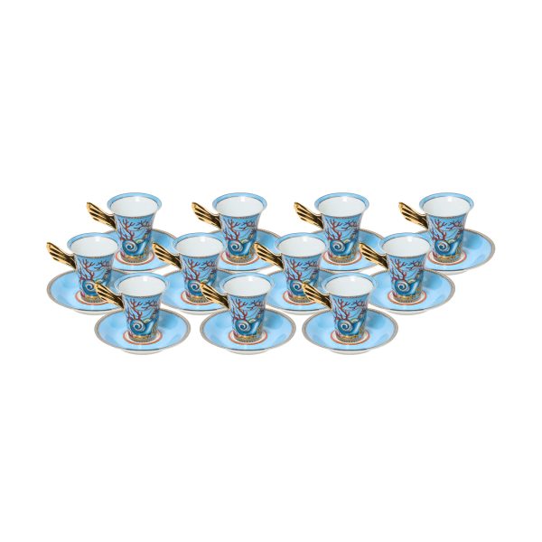 VERSACE. Juego de once tazas con platito modelo «Les Tresors de la Mer» en porcelana de Rosenthal (Alemania, 1879) esmaltada con motivos marinos de tonalidades azules y al oro fino. Marcas en la base.