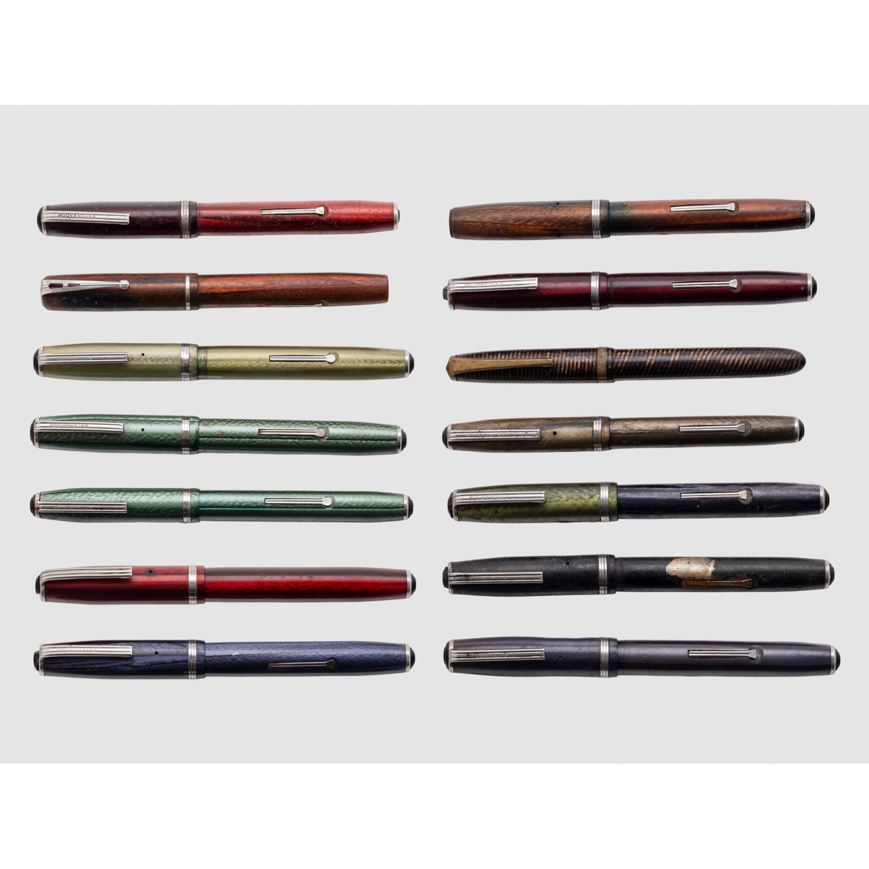 Lote de 14 estilográficas vintage de la firma americana Esterbrook en resina de varias tonalidades con detalles en metal. Sistema de carga por palanca.