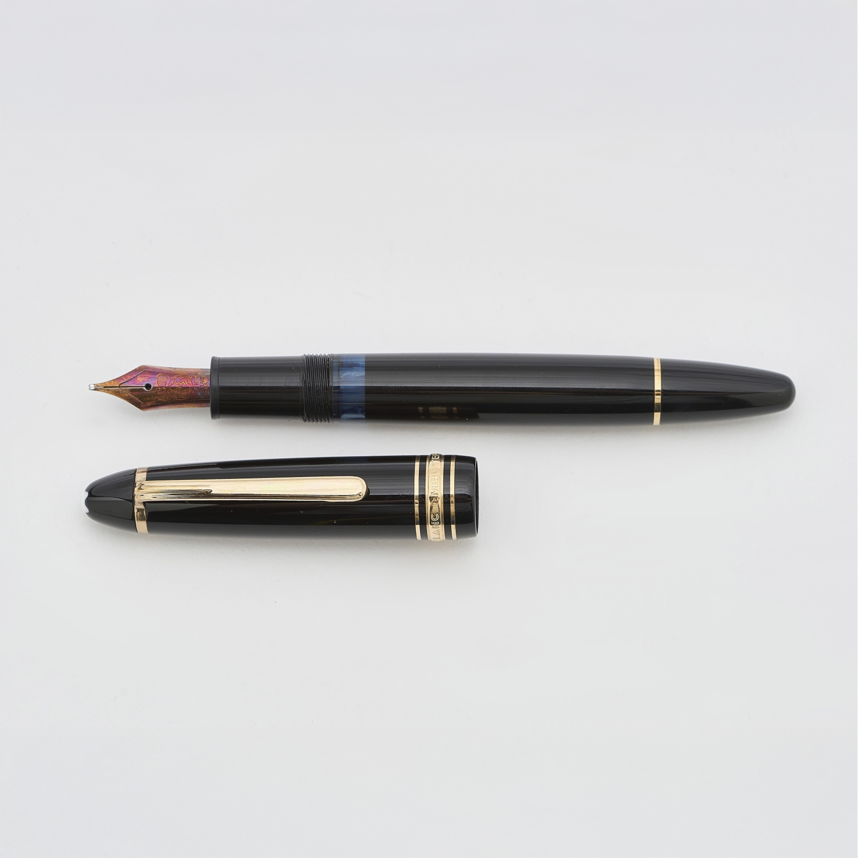 MONTBLANC «Meisterstück Nº146». Estilográfica en resina negra con detalles en plaqué oro. Plumín en oro 14K. Sistema de carga por pistón.