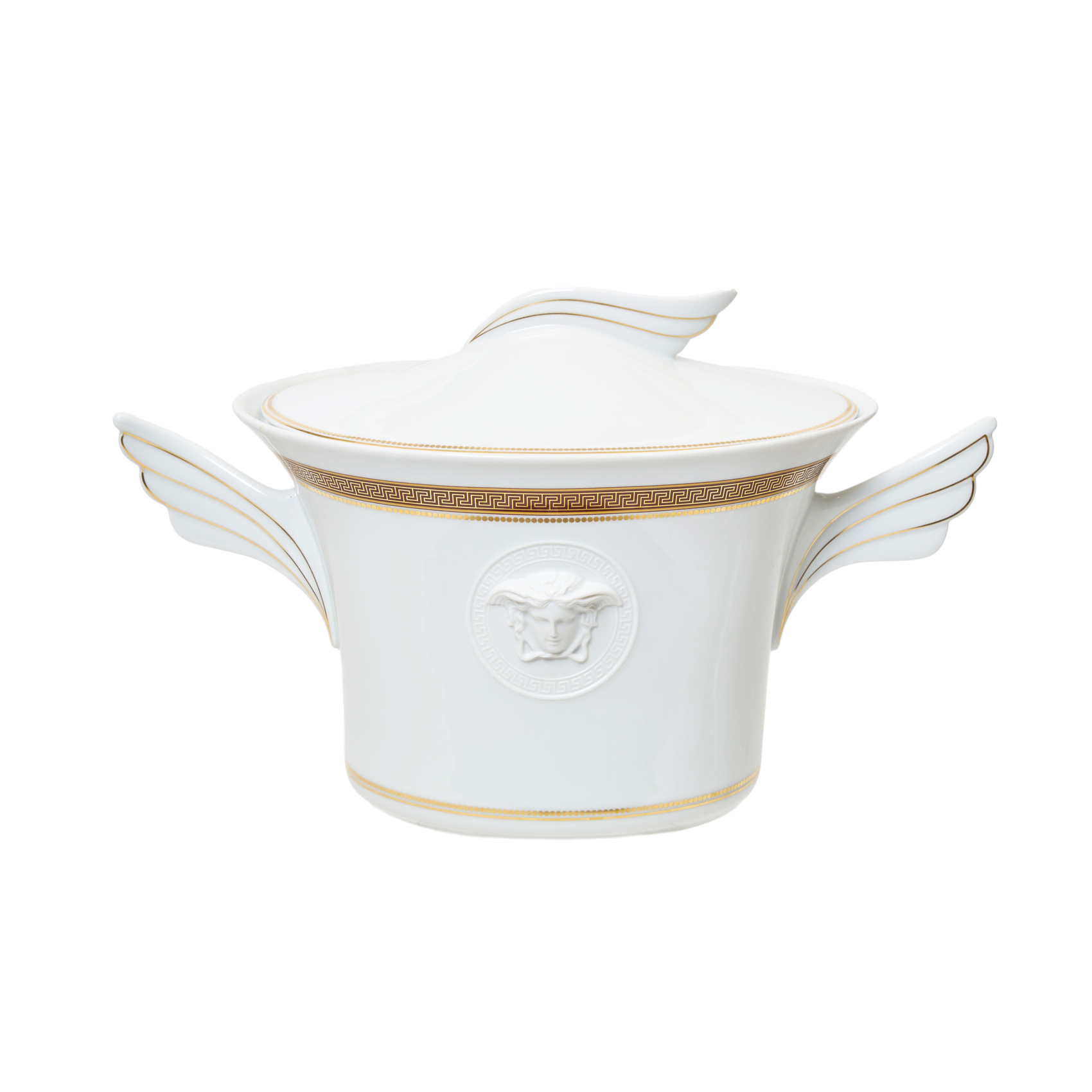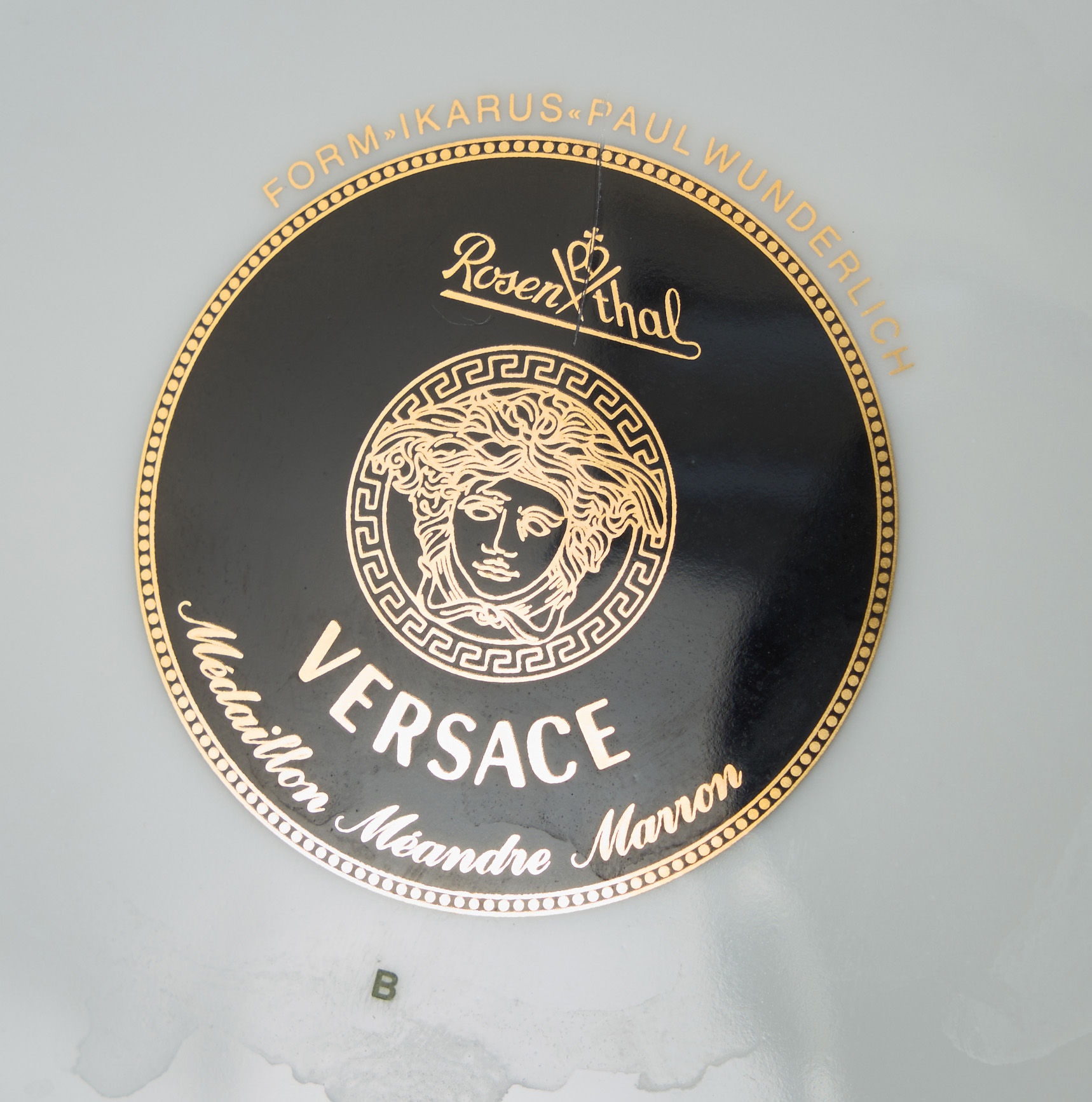 VERSACE. Sopera modelo «Médaillon Méandre Marron» en porcelana de Rosenthal (Alemania, 1879) esmaltada con motivo perimetral de grecas geométricas con fileteados al oro fino y medallón de logotipo mateado en relieve. Diseñada por Paul Wunderlich. Marcas en la base.