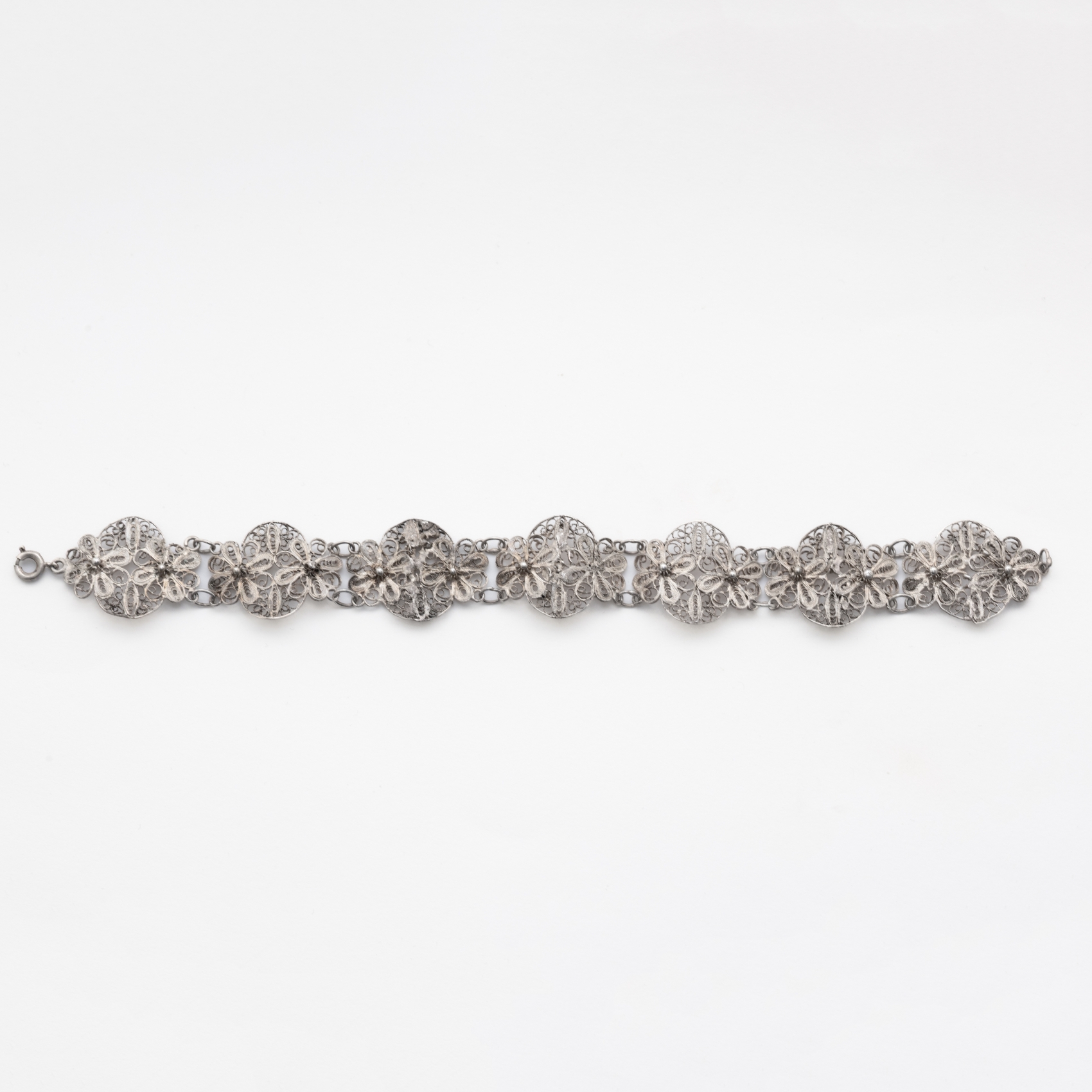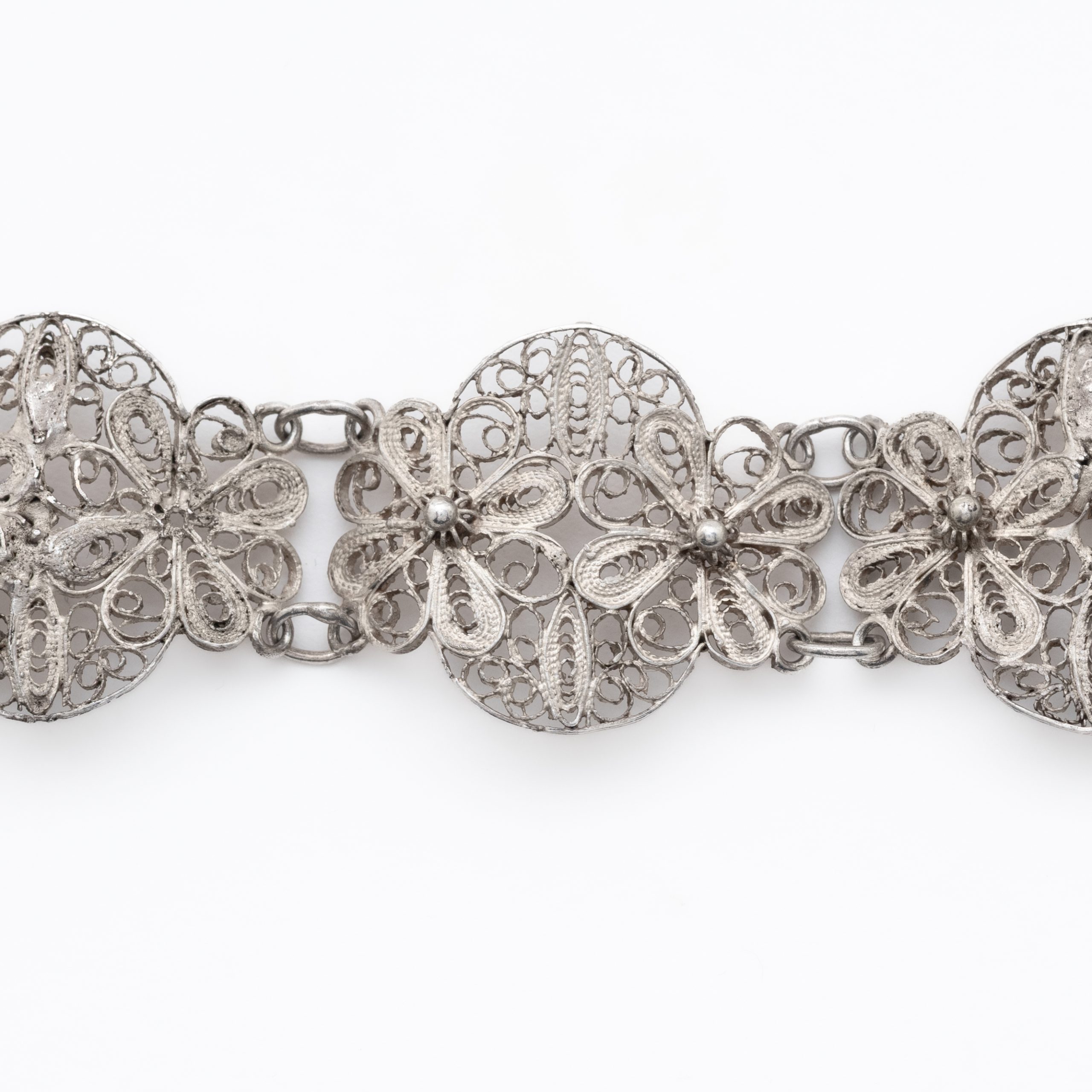 Pulsera de filigrana estilo charro con patrón floral en plata.