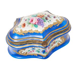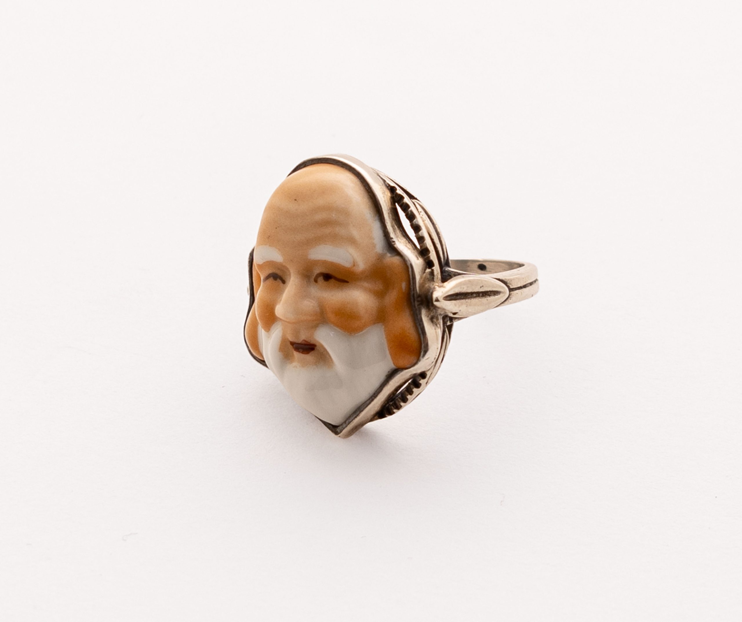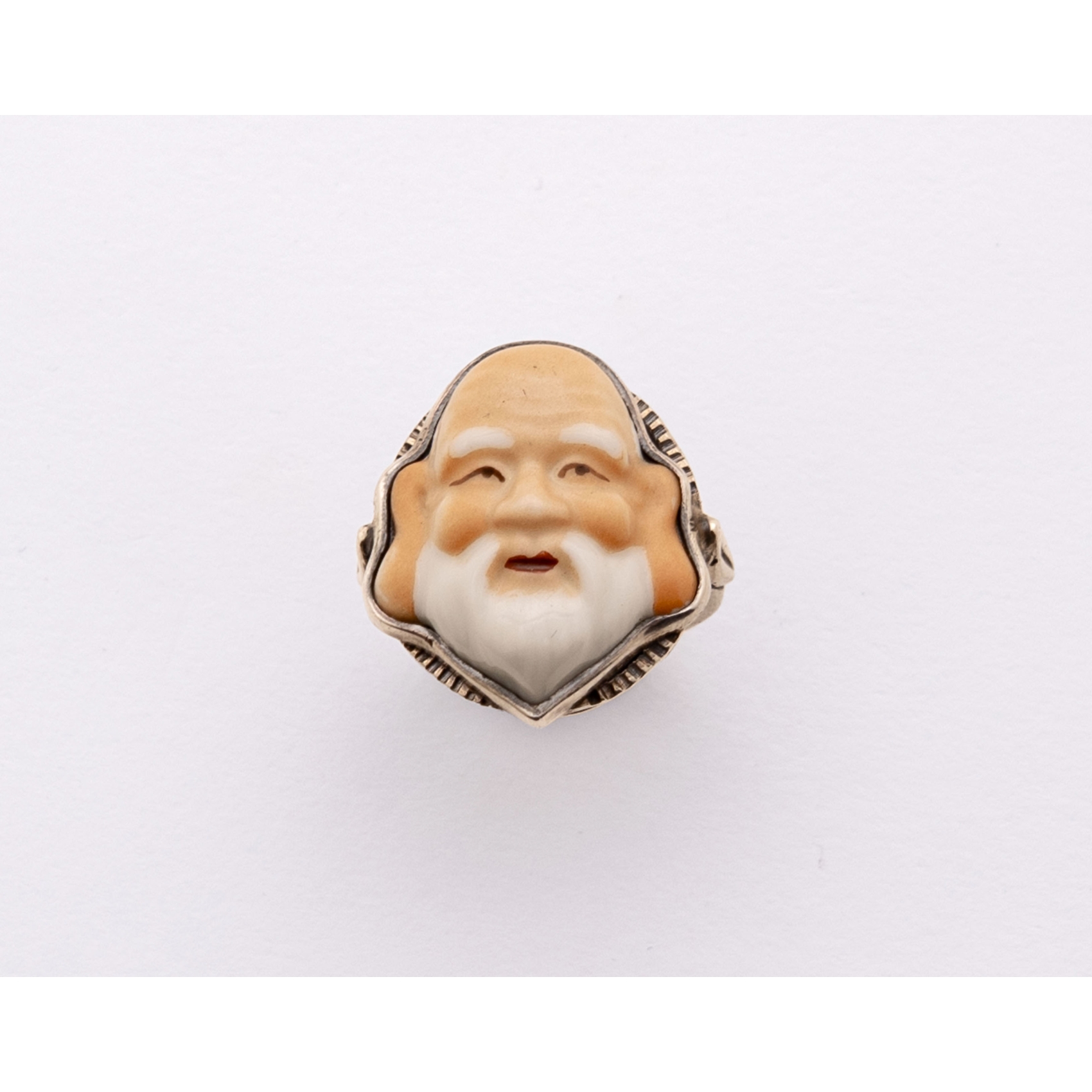 Sortija en plata con botón japonés en porcelana (Toshykane) representando a uno de los siete dioses de la fortuna.