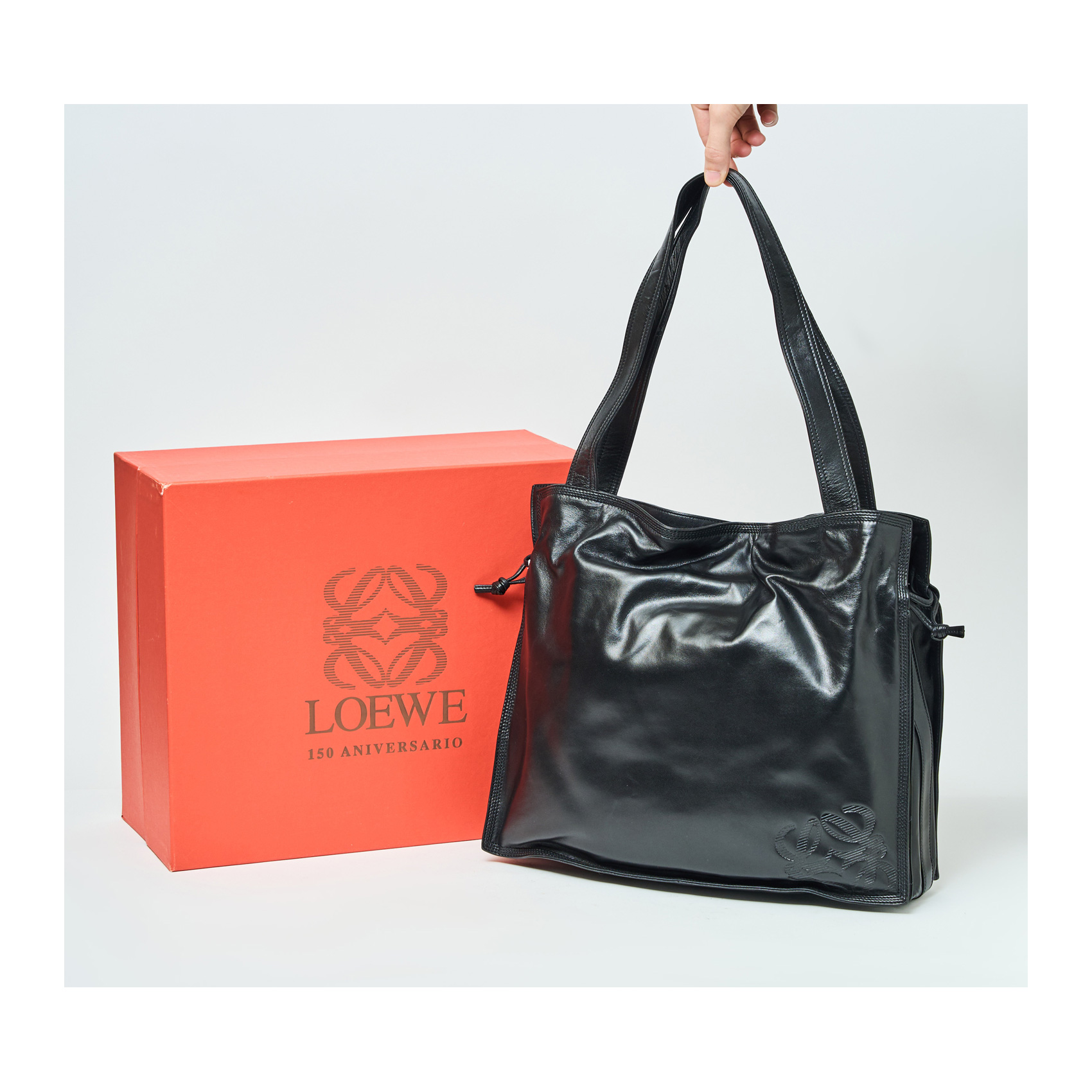LOEWE. Bolso en cuero ovino de tonalidad negra con cierre de botón imantado y logotipo de la firma grabado en relieve. Adjunta funda dustbag original y certificado de composición. Nuevo sin estrenar. Presenta ligeros desperfectos la piel en el interior.